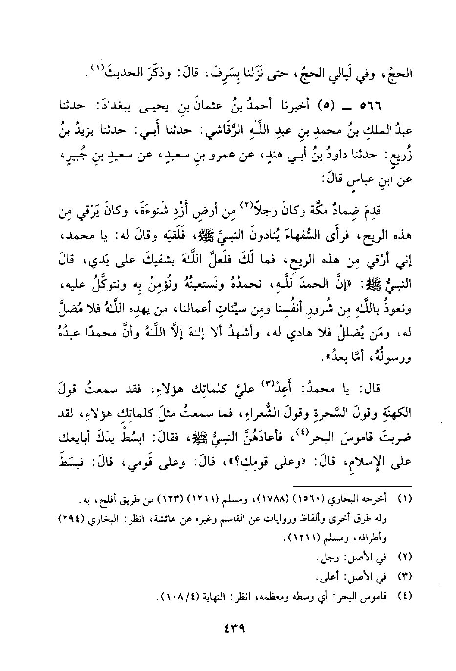 566 - (5) أَخْبَرَنَا أَحْمَدُ بْنُ عُثْمَانَ بْنِ يَحْيَى بِبَغْدَادَ: حَدَّثَنَا عَبْدُ الْمَلِكِ بْنُ مُحَمَّدِ بْنِ عَبْدِ اللَّهِ الرَّقَاشِيُّ: حَدَّثَنَا أَبِي: حَدَّثَنَا يَزِيدُ بْنُ زُرَيْعٍ: حَدَّثَنَا دَاوُدُ بْنُ أَبِي هِنْدٍ، عَنْ عَمْرِو بْنِ سَعِيدٍ، عَنْ سَعِيدِ بْنِ جُبَيْرٍ، عَنْ ابْنِ عَبَّاسٍ قَالَ: قَدِمَ ضَمَّادٌ مَكَّةَ وَكَانَ رَجُلا مِنْ أَرْضِ أَزْدِ شَنُوءَةَ، وَكَانَ يَرْقِي مِنْ هَذِهِ الرِّيحِ، فَرَأَى السُّفَهَاءَ يُنَادُونَ النَّبِيّ صَلَّى اللَّهُ عَلَيْهِ وَسَلَّمَ، فَلَقِيَهُ وَقَالَ لَهُ: يَا مُحَمَّدُ، إِنِّي أَرْقِي مِنْ هَذِهِ الرِّيحِ، فَمَا لَكَ فَلَعَلَّ اللَّهَ يَشْفِيكَ عَلَى يَدَيَّ، قَالَ النَّبِيّ صَلَّى اللَّهُ عَلَيْهِ وَسَلَّمَ: إِنَّ الْحَمْدَ لِلَّهِ، نَحْمَدُهُ وَنَسْتَعِينُهُ وَنُؤْمِنُ بِهِ وَنَتَوَكَّلُ عَلَيْهِ، وَنَعُوذُ بِاللَّهِ مِنْ شُرُورِ أَنْفُسِنَا وَمِنْ سَيِّئَاتِ أَعْمَالِنَا، مَنْ يَهْدِهِ اللَّهُ فَلا مُضِلَّ لَهُ، وَمَنْ يُضْلِلْ فلا هادي له، وأشهد أَلا إِلَهَ إِلا اللَّهَ وَأَنَّ مُحَمَّدًا عَبْدُهُ وَرَسُولُهُ، أَمَّا بَعْدُ. قَالَ: يَا مُحَمَّدُ: أَعِدْ عَلَيَّ كَلِمَاتَكَ هَؤُلاءِ، فَقَدْ سَمِعْتُ قَوْلَ الْكَهَنَةِ وَقَوْلَ السَّحَرَةِ وَقَوْلَ الشُّعَرَاءِ، فَمَا سَمِعْتُ مِثْلَ كَلِمَاتِكَ هَؤُلاءِ، لَقَدْ ضَرَبْتَ قَامُوسَ الْبَحْرِ، فَأَعَادَهُنَّ النَّبِيّ صَلَّى اللَّهُ عَلَيْهِ وَسَلَّمَ، فَقَالَ: ابْسُطْ يَدَكَ أُبَايِعْكَ عَلَى الإِسْلامِ، قَالَ: وَعَلَى قَوْمِكَ؟، قَالَ: وَعَلَى قَوْمِي، قَالَ: فَبَسَطَ -[440]- النَّبِيّ صَلَّى اللَّهُ عَلَيْهِ وَسَلَّمَ يَدَهُ فَبَايَعَهُ.