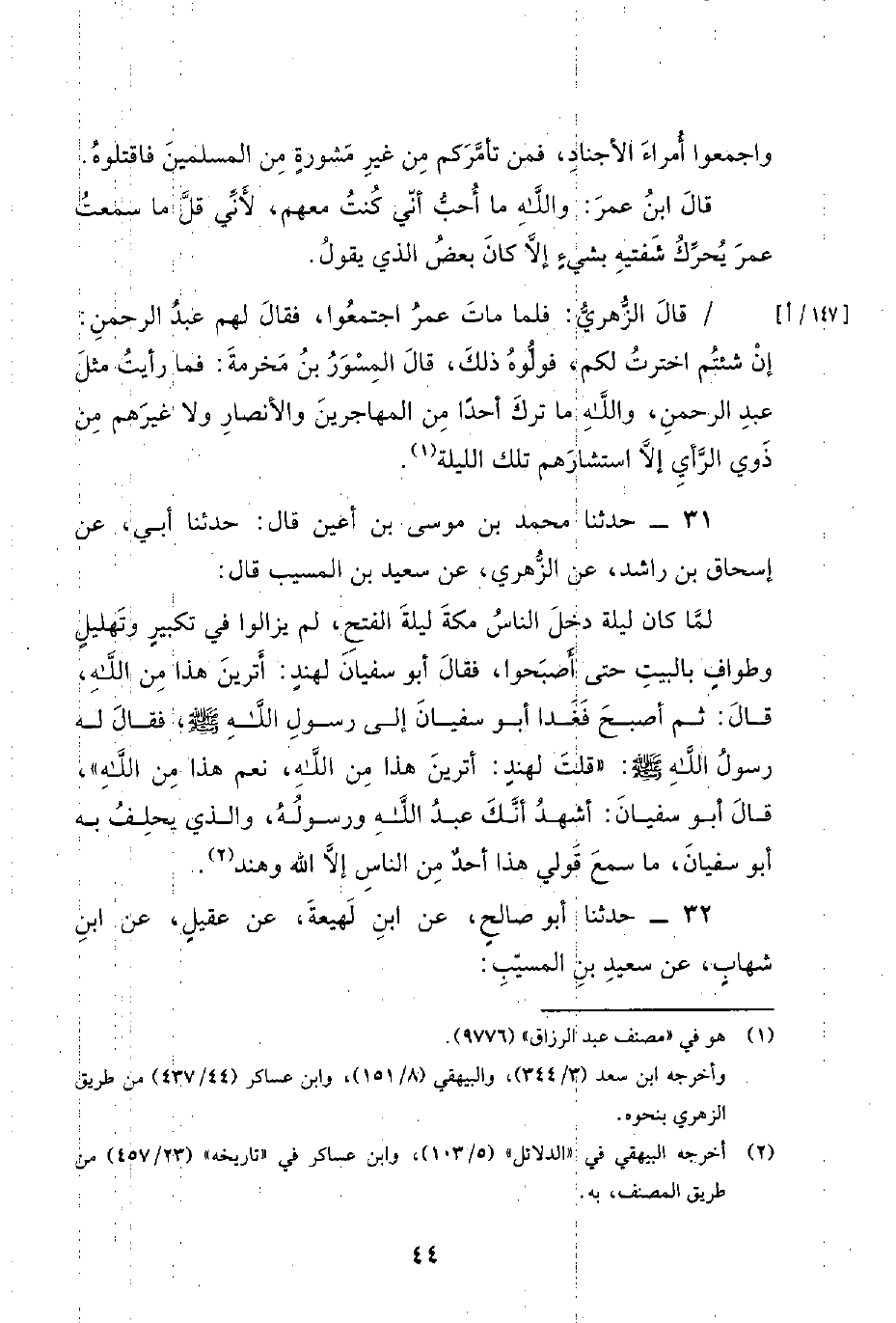 31 - حَدَّثَنَا مُحَمَّدُ بْنُ مُوسَى بْنُ أَعْيَنَ قَالَ: حَدَّثَنَا أَبِي، عَنْ إِسْحَاقَ بْنِ رَاشِدٍ، عَنِ الزُّهْرِيِّ، عَنْ سَعِيدِ بْنِ الْمُسَيِّبِ قَالَ: لَمَّا كَانَ لَيْلَةَ دَخَلَ النَّاسُ مَكَّةَ لَيْلَةَ الْفَتْحِ، لَمْ يَزَالُوا فِي تَكْبِيرٍ وَتَهْلِيلٍ وَطَوَافٍ بِالْبَيْتِ حَتَّى أَصْبَحُوا، فَقَالَ أَبُو سُفْيَانَ لِهِنْدٍ: أَتَرَيْنَ هَذَا مِنَ اللَّهِ، قَالَ: ثُمَّ أَصْبَحَ فَغَدَا أَبُو سُفْيَانَ إِلَى رَسُولِ اللَّهِ صَلَّى اللَّهُ عَلَيْهِ وَسَلَّمَ، فَقَالَ لَهُ رَسُولُ اللَّهِ صَلَّى اللَّهُ عَلَيْهِ وَسَلَّمَ: قُلْتَ لِهِنْدٍ: أَتَرَيْنَ هَذَا مِنَ اللَّهِ، نَعَمْ هَذَا مِنَ اللَّهِ، قَالَ أَبُو سُفْيَانَ، أَشْهَدُ أَنَّكَ عَبْدُ اللَّهِ وَرَسُولُهُ، وَالَّذِي يَحْلِفُ بِهِ أَبُو سُفْيَانَ، مَا سَمِعَ قَوْلِي هَذَا أَحَدٌ مِنَ النَّاسِ إِلا اللَّهُ وهند.
