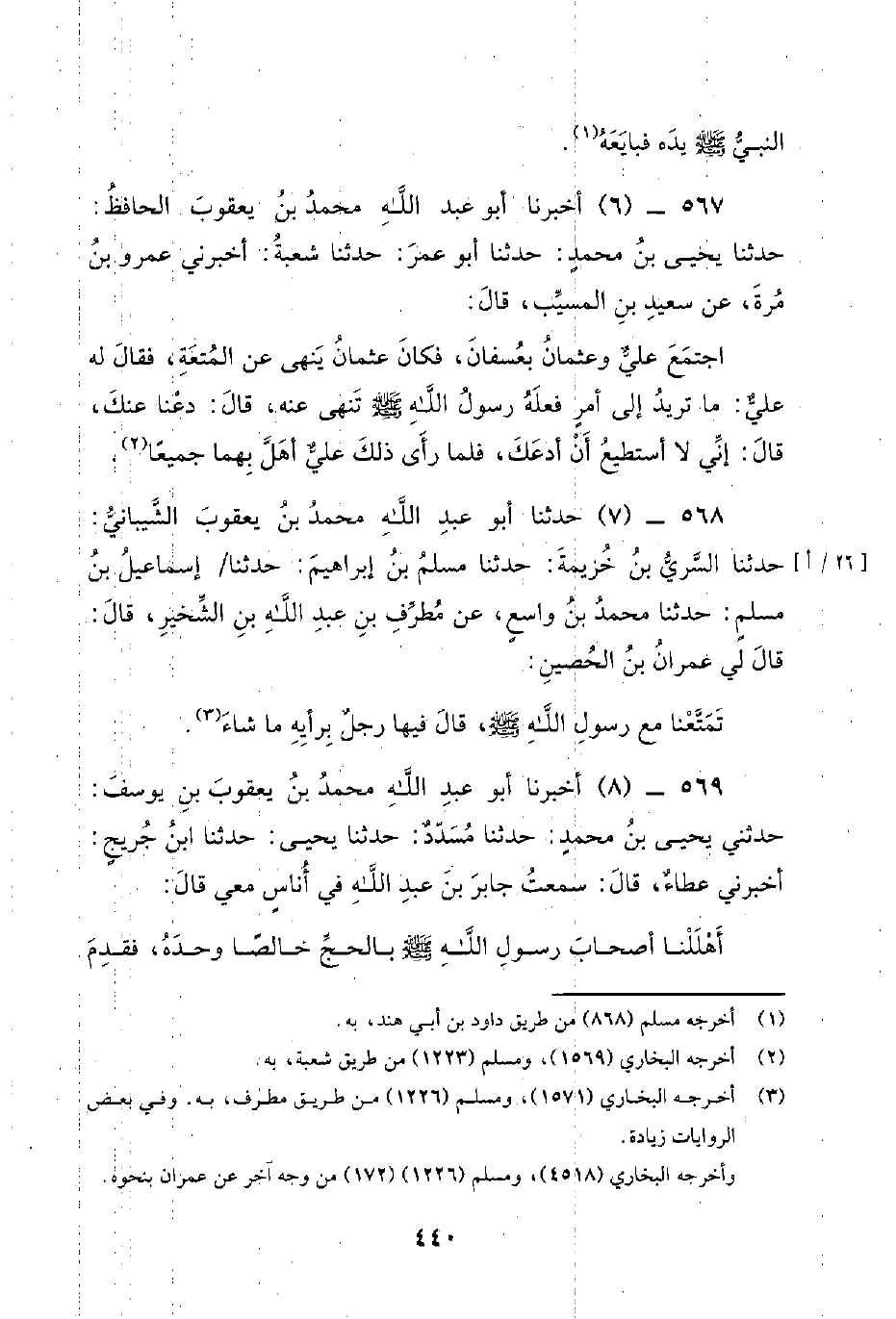 568 - (7) حَدَّثَنَا أَبُو عَبْدِ اللَّهِ مُحَمَّدُ بْنُ يَعْقُوبَ الشَّيْبَانِيُّ: حَدَّثَنَا السَّرِيُّ بْنُ خُزَيْمَةَ: حَدَّثَنَا مُسْلِمُ بْنُ إِبْرَاهِيمَ: حَدَّثَنَا / إِسْمَاعِيلُ بْنُ مُسْلِمٍ: حَدَّثَنَا مُحَمَّدُ بْنُ وَاسِعٍ، عَنْ مُطَرِّفِ بْنِ عَبْدِ اللَّهِ بْنِ الشِّخِّيرِ، قَالَ: قَالَ لِي عِمْرَانُ بْنُ الْحُصَيْنِ: تَمَتَّعْنَا مَعَ رَسُول اللَّهِ صَلَّى اللَّهُ عَلَيْهِ وَسَلَّمَ، قَالَ فيها رجل برأيه ما شاء.