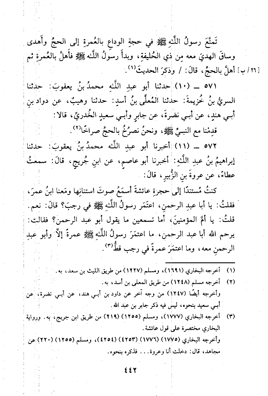572 - (11) أَخْبَرَنَا أَبُو عَبْدِ اللَّهِ مُحَمَّدُ بْنُ يَعْقُوبَ: حَدَّثَنَا إِبْرَاهِيمُ بْنُ عَبْدِ اللَّهِ: أَخْبَرَنَا أَبُو عَاصِمٍ، عَنِ ابْنِ جُرَيْجٍ، قَالَ: سَمِعْتُ عَطَاءً، عَنْ عُرْوَةَ بْنِ الزُّبَيْرِ، قَالَ: كُنْتُ مُسْتَنِدًا إلى حجرة عائشة أسمع صوت اسْتِنَانِهَا وَمَعَنَا ابْنُ عُمَرَ، فَقُلْتُ: يَا أَبَا عَبْدِ الرَّحْمَنِ، اعْتَمَرَ رَسُول اللَّهِ صَلَّى اللَّهُ عَلَيْهِ وَسَلَّمَ فِي رَجَبٍ؟ قَالَ: نَعَمْ. قُلْتُ: يَا أُمَّ الْمُؤْمِنِينَ، أَمَا تَسْمَعِينَ مَا يَقُولُ أَبُو عَبْدِ الرَّحْمَنِ؟ فَقَالَتْ: يَرْحَمُ اللَّهُ أَبَا عَبْدِ الرَّحْمَنِ، مَا اعْتَمَرَ رَسُول اللَّهِ صَلَّى اللَّهُ عَلَيْهِ وَسَلَّمَ عُمْرَةً إِلا وَأَبُو عَبْدِ الرَّحْمَنِ مَعَهُ، وَمَا اعْتَمَرَ عُمْرَةً فِي رَجَبٍ قط.