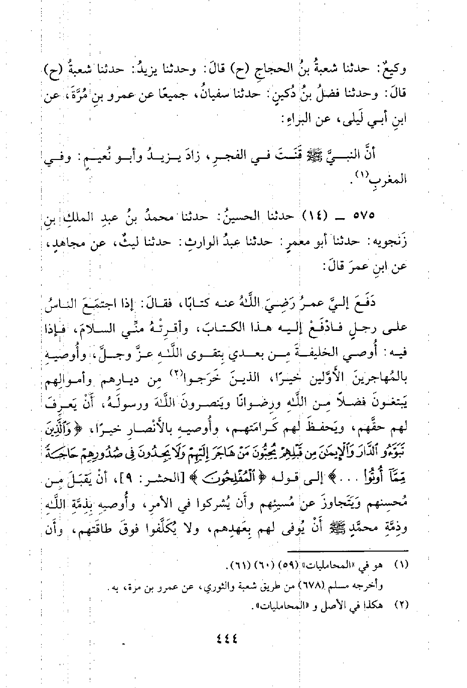 575 - (14) حَدَّثَنَا الْحُسَيْنُ: حَدَّثَنَا مُحَمَّدُ بْنُ عَبْدِ الْمَلِكِ بْنِ زَنْجَوَيْهِ: حَدَّثَنَا أَبُو مَعْمَرٍ: حَدَّثَنَا عَبْدُ الْوَارِثِ: حَدَّثَنَا لَيْثٌ، عَنْ مُجَاهِدٍ، عَنِ ابْنِ عُمَرَ قَالَ: دَفَعَ إِلَيَّ عُمَرُ رَضِيَ اللَّهُ عَنْهُ كِتَابًا، فَقَالَ: إِذَا اجْتَمَعَ النَّاسُ عَلَى رَجُلٍ فَادْفَعْ إِلَيْهِ هَذَا الْكِتَابَ، وَأَقْرِئْهُ مِنِّي السَّلامَ، فَإِذَا فِيهِ: أُوصِي الْخَلِيفَةَ مِنْ بَعْدِي بِتَقْوَى اللَّهِ عَزَّ وَجَلَّ، وَأُوصِيهِ بِالْمُهَاجِرِينَ الأَوَّلِينَ خَيْرًا: الَّذِينَ خَرَجُوا مِنْ دِيَارِهِمْ وَأَمْوَالِهِمْ يَبْتَغُونَ فَضْلا مِنَ اللَّهِ وَرِضْوَانًا وَيَنْصُرُونَ اللَّهَ وَرَسُولَهُ، أَنْ يَعْرِفَ لَهُمْ حَقَّهُمْ، وَيَحْفَظَ لَهُمْ كَرَامَتَهُمْ، وأوصيه بالأنصار خيرا، {الذين تبوءو الدار والإيمن مِنْ قَبْلِهِمْ يُحِبُّونَ مَنْ هَاجَرَ إِلَيْهِمْ وَلا يجدون في صدورهم حاجة مما أوتوا .. } إلى قوله {المفلحون}، أَنْ يَقْبَلَ مِنْ مُحْسِنِهِمْ وَيَتَجَاوَزَ عَنْ مُسِيئِهِمْ وَأَنْ يُشْرَكُوا فِي الأَمْرِ، وَأُوصِيهِ بِذِمَّةِ اللَّهِ وَذِمَّةِ مُحَمَّدٍ صَلَّى اللَّهُ عَلَيْهِ وَسَلَّمَ أَنْ يُوَفِّي لَهُمْ بِعَهْدِهِمْ، ولا يكلفوا فوق طاقتهم، وأن -[445]- يُقَاتِلَ مِنْ وَرَائِهِمْ.
