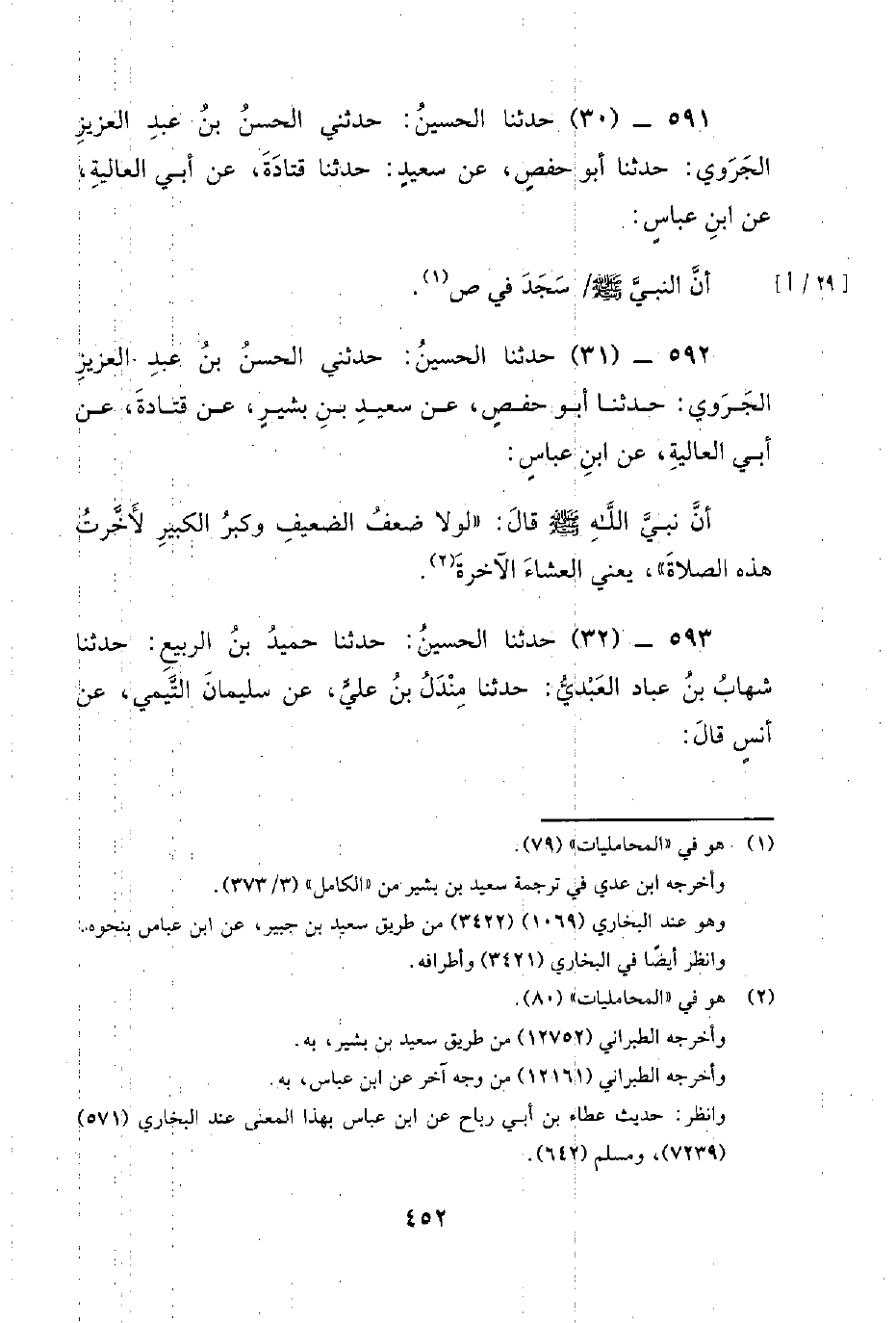 591 - (30) حَدَّثَنَا الْحُسَيْنُ: حَدَّثَنِي الْحَسَنُ بْنُ عَبْدِ الْعَزِيزِ الْجَرَوِيُّ: حَدَّثَنَا أَبُو حَفْصٍ، عَنْ سَعِيدٍ: حَدَّثَنَا قتادة، عن أبي العالية، عن ابن عباس: أَنَّ النَّبِيَّ صَلَّى اللَّهُ عَلَيْهِ وَسَلَّمَ / سَجَدَ في {ص}.