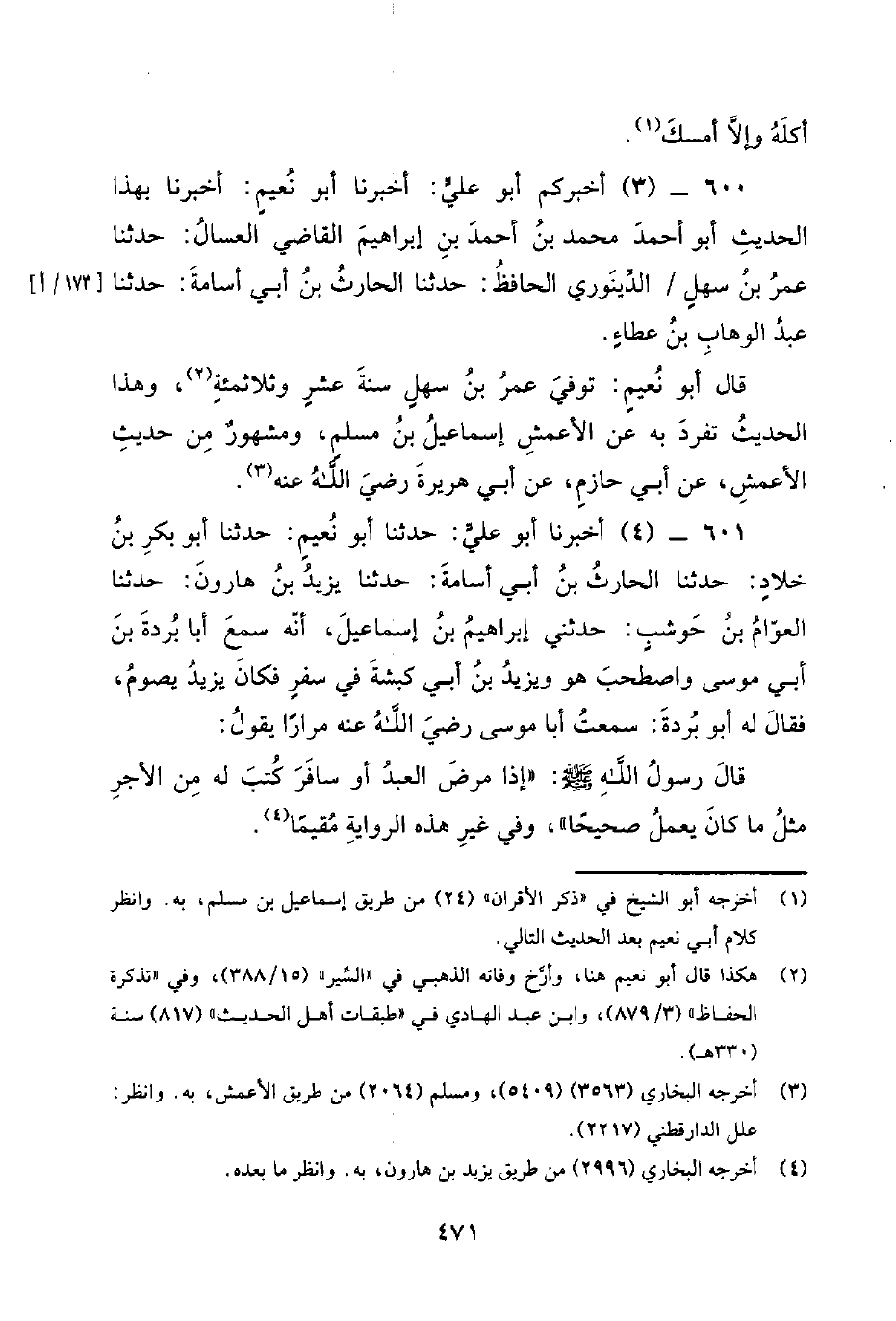 601 - (4) أَخْبَرَنَا أَبُو عَلِيٍّ: حَدَّثَنَا أَبُو نُعَيْمٍ: حَدَّثَنَا أَبُو بَكْرِ بْنُ خَلاد: حَدَّثَنَا الْحَارِثُ بْنُ أَبِي أُسَامَةَ: حَدَّثَنَا يَزِيدُ بْنُ هَارُونَ: حَدَّثَنَا الْعَوَّامُ بْنُ حَوْشَبٍ: حَدَّثَنِي إِبْرَاهِيمُ بْنُ إِسْمَاعِيلَ، أَنَّهُ سَمِعَ أَبَا بَرْدَةَ بْنَ أَبِي مُوسَى وَاصْطَحَبَ هُوَ وَيَزِيدُ بْنُ أَبِي كَبْشَةَ فِي سَفَرٍ فَكَانَ يَزِيدُ يَصُومُ، فَقَالَ لَهُ أَبُو بَرْدَةَ: سَمِعْتُ أَبَا مُوسَى رَضِيَ اللَّهُ عَنْهُ مِرَارًا يَقُولُ: قَالَ رَسُولُ اللَّهِ صَلَّى اللَّهُ عَلَيْهِ وَسَلَّمَ: إِذَا مَرِضَ الْعَبْدُ أَوْ سَافَرَ كُتِبَ لَهُ مِنَ الأَجْرِ مِثْلُ مَا كَانَ يَعْمَلُ صَحِيحًا، وَفِي غَيْرِ هَذِهِ الرِّوَايَةِ مقيما.