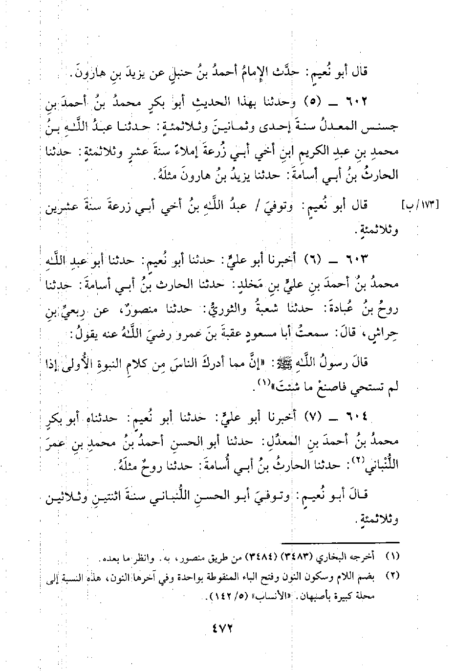 603 - (6) أَخْبَرَنَا أَبُو عَلِيٍّ: حَدَّثَنَا أَبُو نُعَيْمٍ: حَدَّثَنَا أَبُو عَبْدِ اللَّهِ مُحَمَّدُ بْنُ أَحْمَدَ بْنِ عَلِيِّ بْنِ مَخْلَدٍ: حَدَّثَنَا الْحَارِثُ بْنُ أَبِي أُسَامَةَ: حَدَّثَنَا رَوْحُ بْنُ عُبَادَةَ: حَدَّثَنَا شُعْبَةُ وَالثَّوْرِيُّ: حَدَّثَنَا مَنْصُورٌ، عَنْ رِبْعِيِّ بْنِ حِرَاشٍ، قَالَ: سَمِعْتُ أَبَا مَسْعُودٍ عُقْبَةَ بْنَ عَمْرٍو رَضِيَ اللَّهُ عَنْهُ يَقُولُ: قَالَ رَسُولُ اللَّهِ صَلَّى اللَّهُ عَلَيْهِ وَسَلَّمَ: إِنَّ مِمَّا أَدْرَكَ النَّاسُ مِنْ كَلامِ النُّبُوَّةِ الأُولَى إِذَا لَمْ تَسْتَحْيِ فَاصْنَعْ مَا شِئْتَ.