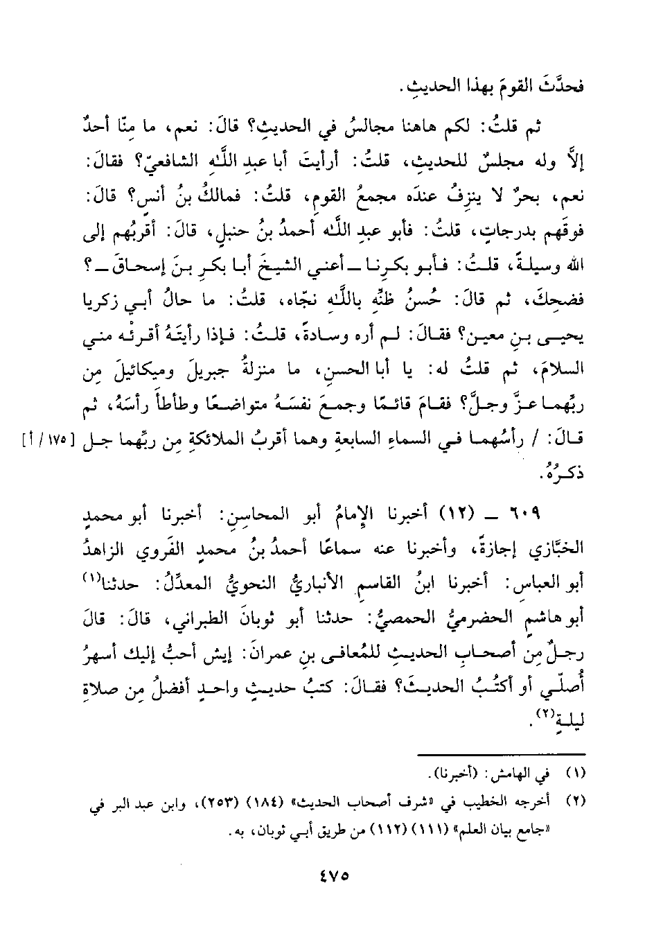 609 - (12) أَخْبَرَنَا الإمام أَبُو المحاسن: أَخْبَرَنَا أَبُو مُحَمَّد الخبازي إجازة، وأَخْبَرَنَا عَنْهُ سماعا أَحْمَد بْن مُحَمَّد الفروي الزاهد أَبُو الْعَبَّاس: أَخْبَرَنَا ابن الْقَاسِم الأنباري النحوي المعدل: حَدَّثَنَا أَبُو هاشم الحضرمي الحمصي: حَدَّثَنَا أَبُو ثوبان الطبراني، قَالَ: قَالَ رجل من أصحاب الْحَدِيث للمعافى بْن عمران: إيش أحب إليك أسهر أصلي أو أكتب الْحَدِيث؟ فقال: كتب حديث واحد أفضل من صلاة ليلة.