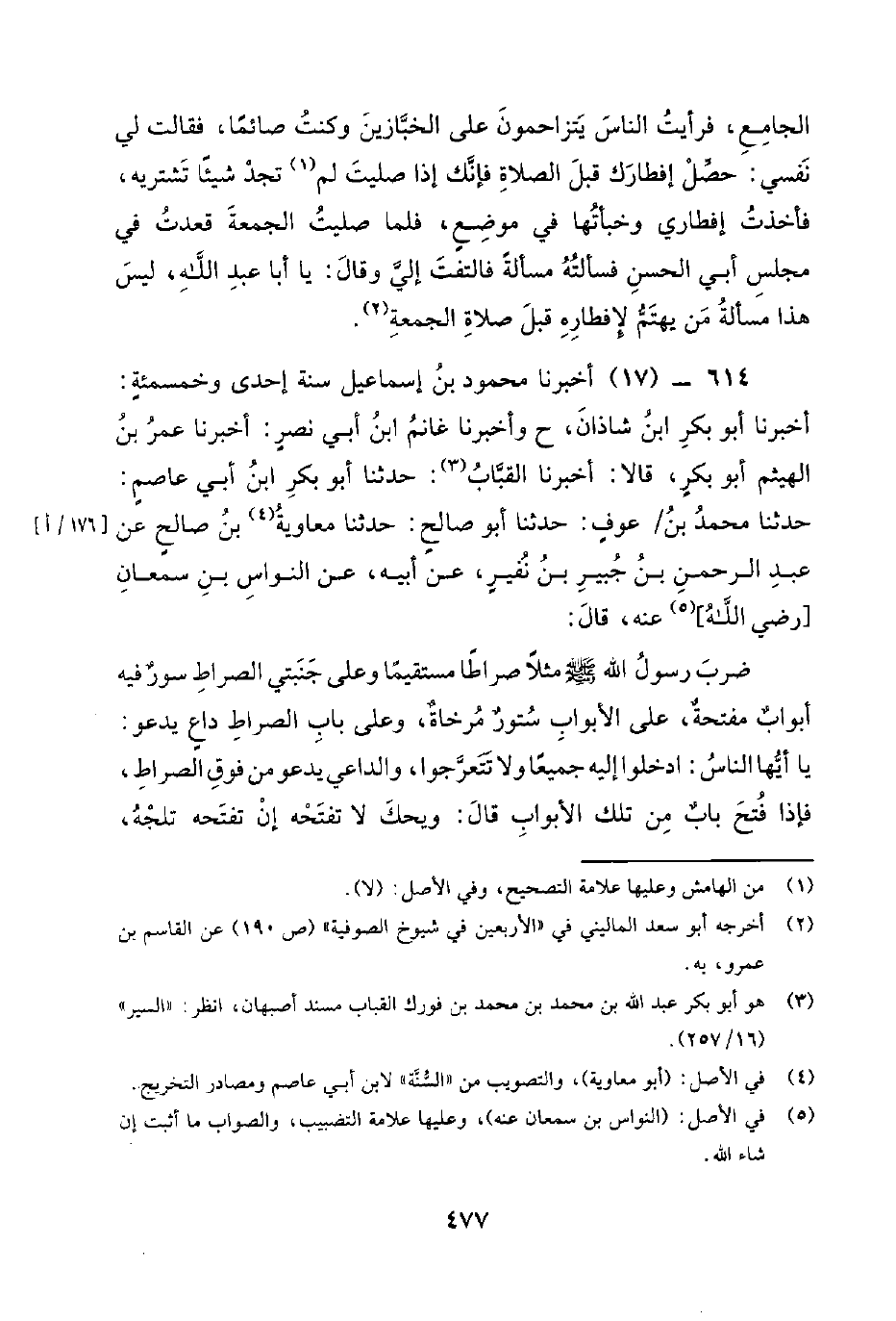 614 - (17) أَخْبَرَنَا مَحْمُودُ بْنُ إسماعيل سنة إحدى وخمسئمة: أخبرنا أبو بكر ابن شاذان، (ح) وأخبرنا غانم ابن أَبِي نَصْرٍ: أَخْبَرَنَا عُمَرُ بْنُ الْهَيْثَمِ أَبُو بَكْرٍ، قَالا: أَخْبَرَنَا الْقَبَّابُ: حَدَّثَنَا أَبُو بَكْرِ ابن أَبِي عَاصِمٍ: حَدَّثَنَا مُحَمَّدُ بْنُ / عَوْفٍ: حَدَّثَنَا أَبُو صَالِحٍ: حَدَّثَنَا مُعَاوِيَةُ بْنُ صَالِحٍ عَنْ عَبْدِ الرَّحْمَنِ بْنِ جُبَيْرِ بْنِ نُفَيْرٍ، عَنْ أَبِيهِ، عَنْ النَّوَّاسِ بنِ سَمْعَانَ رَضِيَ اللَّهُ عَنْهُ، قَالَ: ضَرَبَ رَسُول اللَّهِ صَلَّى اللَّهُ عَلَيْهِ وَسَلَّمَ مَثَلا صِرَاطًا مُسْتَقِيمًا وَعَلَى جَنْبَتَيِ الصِّرَاطِ سُورٌ فِيهِ أَبْوَابٌ مُفَتَّحَةٌ، عَلَى الأَبْوَابِ سُتُورٌ مُرَخَّاةٌ، وَعَلَى بَابِ الصِّرَاطِ دَاعٍ يَدْعُو: يا أيها الناس: ادخلوا إليه جميعا ولا تتعرجوا، الداعي يَدْعُو مِنْ فَوْقِ الصِّرَاطِ، فَإِذَا فُتِحَ بَابٌ مِنْ تِلْكَ الأَبْوَابِ قَالَ: وَيْحَكَ لا تَفْتَحْهُ إِنْ تَفْتَحْهُ تَلِجْهُ، -[478]- وَالصِّرَاطُ الإِسْلامُ، وَالسُّتُورُ حُدُودُ اللَّهِ عَزَّ وَجَلَّ، وَالأَبْوَابُ الْمُفَتَّحَةُ مَحَارِمُ اللَّهِ، وَفِي غَيْرِ هَذِهِ الرِّوَايَةِ: وَالَّذِي يَدْعُو مِنْ فَوْقِهِ وَاعِظُ اللَّهِ عَزَّ وَجَلَّ.