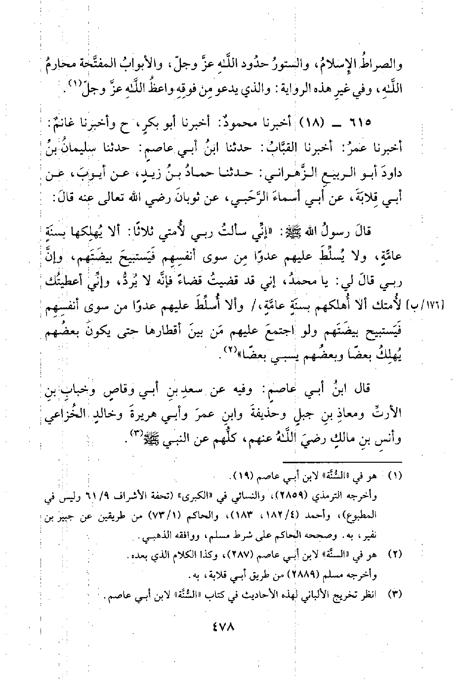 615 - (18) أََخْبَرَنَا مَحْمُودٌ: أَخْبَرَنَا أَبُو بَكْرٍ، (ح) وَأَخْبَرَنَا غَانِمٌ: أَخْبَرَنَا عُمَرُ: أَخْبَرَنَا الْقَبَّابُ: حَدَّثَنَا ابْنُ أَبِي عَاصِمٍ: حَدَّثَنَا سُلَيْمَانُ بْنُ دَاوُدَ أَبُو الرَّبِيعِ الزَّهْرَانِيُّ: حَدَّثَنَا حَمَّادُ بْنُ زَيْدٍ، عَنْ أَيُّوبَ، عَنْ أَبِي قِلابَةَ، عَنْ أَبِي أَسْمَاءَ الرحبي، عن ثوبان رضي الله عَنْهُ قَالَ: قَالَ رَسُولُ اللَّهِ صَلَّى اللَّهُ عَلَيْهِ وَسَلَّمَ: إِنِّي سَأَلْتُ رَبِّي لأُمَّتِي ثَلاًثا: أَلا يُهْلِكَهَا بِسِنَةٍ عَامَّةٍ، وَلا يُسَلِّطَ عليهم عدوا من سوى أنفسهم فيستبيح بيضتهم، وَإِنَّ رَبِّي قَالَ لِي: يَا مُحَمَّدُ، إِنِّي قَدْ قَضَيْتُ قَضَاءً فَإِنَّهُ لا يُرَدُّ، وَإِنِّي أَعْطَيْتُكَ لأُمَّتِكَ أَلا أُهْلِكَهُمْ بِسِنَةٍ عَامَّةٍ، / وَأَلا أُسَلِّطَ عليهم عدوا من سوى أنفسهم فيستبيح بيضتهم وَلَوِ اجْتَمَعَ عَلَيْهِمْ مِنْ بَيْنِ أَقْطَارِهَا حَتَّى يَكُونَ بَعْضُهُمْ يُهْلِكُ بَعْضًا وَبَعْضُهُمْ يَسْبِي بَعْضًا.