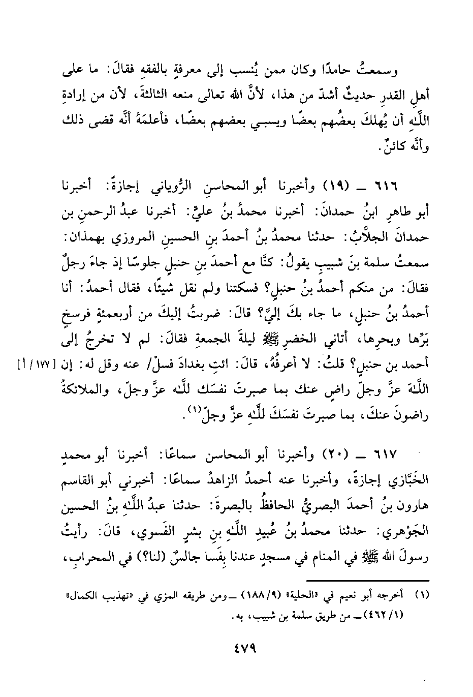 616 - (19) وأَخْبَرَنَا أَبُو المحاسن الروياني إجازة: أخبرنا أبو طاهر ابن حمدان: أَخْبَرَنَا مُحَمَّد بْن علي: أَخْبَرَنَا عَبْد الرَّحْمَنِ بْن حمدان الجلاب: حَدَّثَنَا محمد بن أحمد بن الحسين المروزي بهمذان: سمعت سلمة بْن شبيب يقول: كنا مع أَحْمَد بْن حنبل جلوسا إذ جاء رجل فقال: من منكم أَحْمَد بْن حنبل؟ فسكتنا ولم نقل شيئا، فقال أَحْمَد: أنا أَحْمَد بْن حنبل، ما جاء بك إلي؟ قال: ضربت إليك من أربعمئة فرسخ برها وبحرها، أتاني الخضر صَلَّى اللَّهُ عَلَيْهِ وَسَلَّمَ ليلة الجمعة فقال: لم لا تخرج إِلَى أَحْمَد بْن حنبل؟ قلت: لا أعرفه، قَالَ: ائت بغداد فسل / عَنْهُ وقل له: إن اللَّه عَزَّ وَجَلَّ راض عَنْك بما صبرت نفسك لله عَزَّ وَجَلَّ، والملائكة رضوان عَنْك، بما صبرت نفسك لله عَزَّ وَجَلَّ.