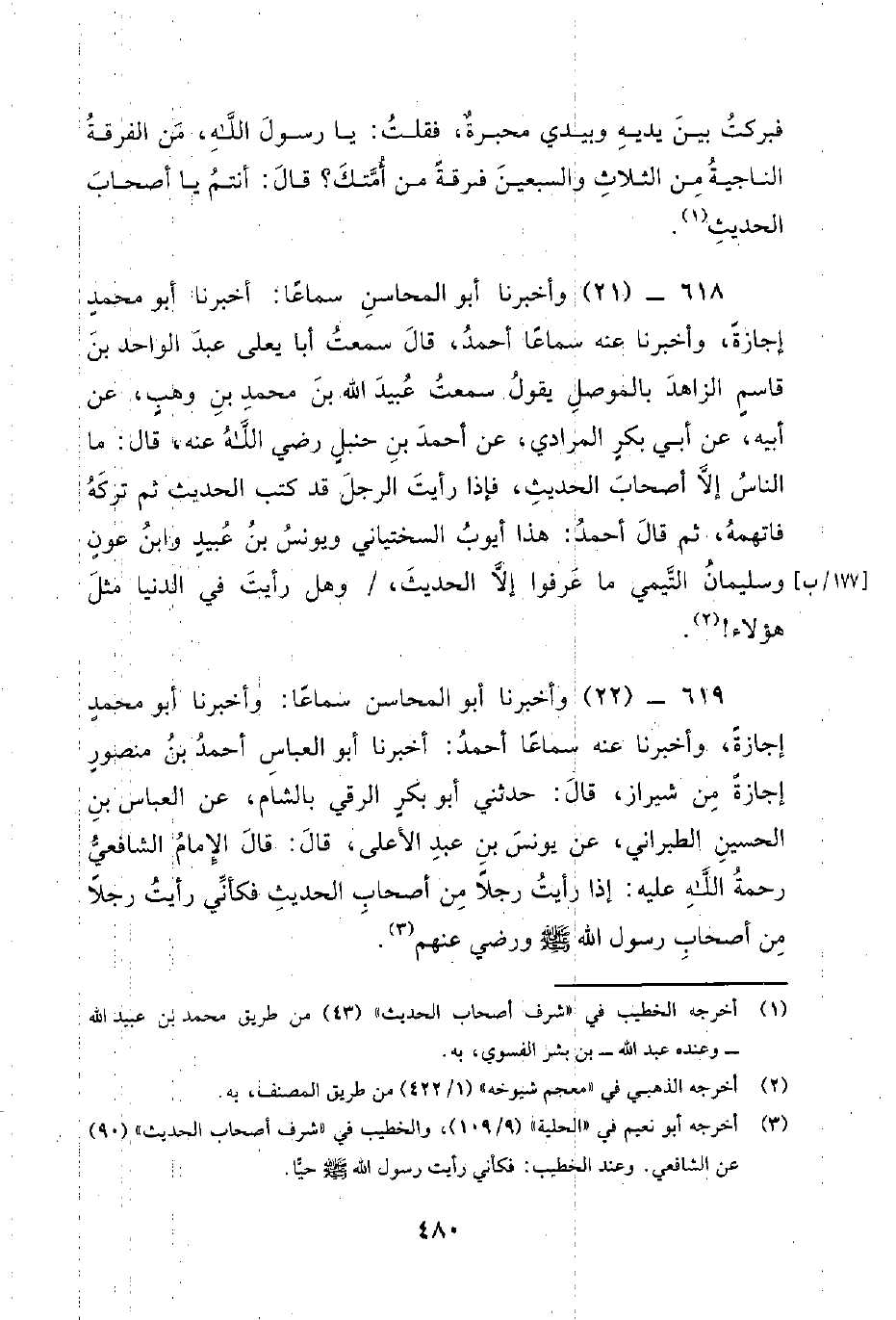 618 - (21) وأخبرنا أبو المحاسن سماعا: أخبرنا أبو محمد إجازة، وأَخْبَرَنَا عَنْهُ سماعا أَحْمَد، قَالَ سمعت أبا يعلى عَبْد الواحد بْن قاسم الزاهد بالموصل يقول سمعت عبيد اللَّه بْن مُحَمَّدِ بْنِ وهب، عَنْ أبيه، عَنْ أَبِي بكر المرادي، عَنْ أَحْمَد بْن حنبل رَضِيَ اللَّهُ عَنْهُ، قَالَ: ما الناس إلا أصحاب الْحَدِيث، فإذا رأيت الرجل قد كتب الْحَدِيث ثُمَّ تركه فاتهمه، ثُمَّ قَالَ أَحْمَد: هذا أيوب السختياني ويونس بْن عبيد وابن عون وسليمان التيمي ما عرفوا إلا الْحَدِيث، / وهل رأيت فِي الدنيا مثل هؤلاء!.
