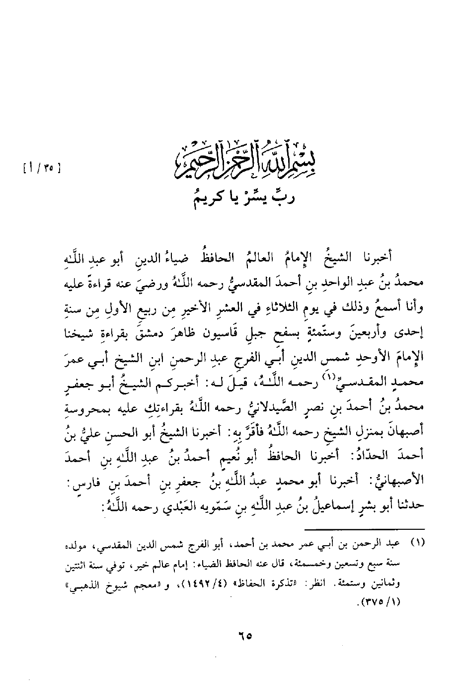 أَخْبَرَنَا الشَّيْخُ الإِمَامُ الْعَالِمُ الْحَافِظُ ضِيَاءُ الدِّينِ أَبُو عَبْدِ اللَّهِ مُحَمَّدُ بْنُ عَبْدِ الْوَاحِدِ بْنِ أَحْمَدَ الْمَقْدِسِيُّ رَحِمَهُ اللَّهُ وَرَضِيَ عَنْهُ قِرَاءَةً عَلَيْهِ وَأَنَا أَسْمَعُ وَذَلِكَ فِي يوم الثلاثاء في العشر الأخير مِنْ رَبِيعٍ الأَوَّلِ مِنْ سَنَةِ إِحْدَى وَأَرْبَعِينَ وستمئة بِسَفْحِ جَبَلِ قَاسِيُونَ ظَاهِرَ دِمَشْقَ بِقِرَاءَةِ شَيْخِنَا الإِمَامِ الأَوْحَدِ شَمْسِ الدِّينِ أَبِي الْفَرَجِ عَبْدِ الرحمن ابن الشَّيْخِ أَبِي عُمَرَ مُحَمَّدٍ الْمَقْدِسِيِّ رَحِمَهُ اللَّهُ، قِيلَ لَهُ: أَخْبَرَكُمُ الشَّيْخُ أَبُو جَعْفَرٍ مُحَمَّدُ بْنُ أَحْمَدَ بْنِ نَصْرٍ الصَّيْدَلانِيُّ رَحِمَهُ اللَّهُ بِقِرَاءَتِكَ عَلَيْهِ بِمَحْرُوسَةِ أَصْبَهَانَ بِمَنْزِلِ الشَّيْخِ رَحِمَهُ الله فأقر به: أخبرنا الشَّيْخُ أَبُو الْحَسَنِ عَلِيُّ بْنُ أَحْمَدَ الْحَدَّادُ: أخبرنا الْحَافِظُ أَبُو نُعَيْمٍ أَحْمَدُ بْنُ عَبْدِ اللَّهِ بن أحمد الأصبهاني: أخبرنا أَبُو مُحَمَّدٍ عَبْدُ اللَّهِ بْنُ جَعْفَرِ بْنِ أحمد بن فارس: حدثنا أبو بشر إسماعيل بن عبد الله سمويه العبدي رحمه الله: