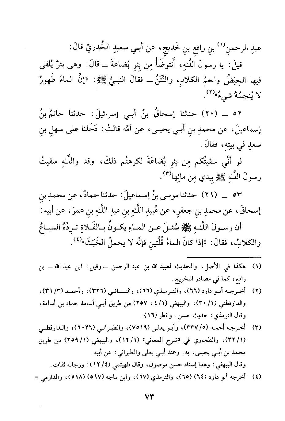 53 - (21) حدثنا موسى بن إسماعيل: حدثنا حماد، عن محمد بن إسحاق، عن محمد بن جعفر، عَنْ عُبَيْدِ اللَّهِ بْنِ عَبْدِ اللَّهِ بْنِ عُمَرَ، عَنْ أَبِيهِ: أَنَّ رَسُول اللَّهِ صَلَّى اللَّهُ عَلَيْهِ وَسَلَّمَ سُئِلَ عَنِ الْمَاءِ يَكُونُ بِالْفَلاةِ تَرِدُهُ السِّبَاعُ وَالْكِلابُ، فَقَالَ: إِذَا كَانَ الْمَاءُ قُلَّتَيْنِ فَإِنَّهُ لا يَحْمِلُ الخبث.