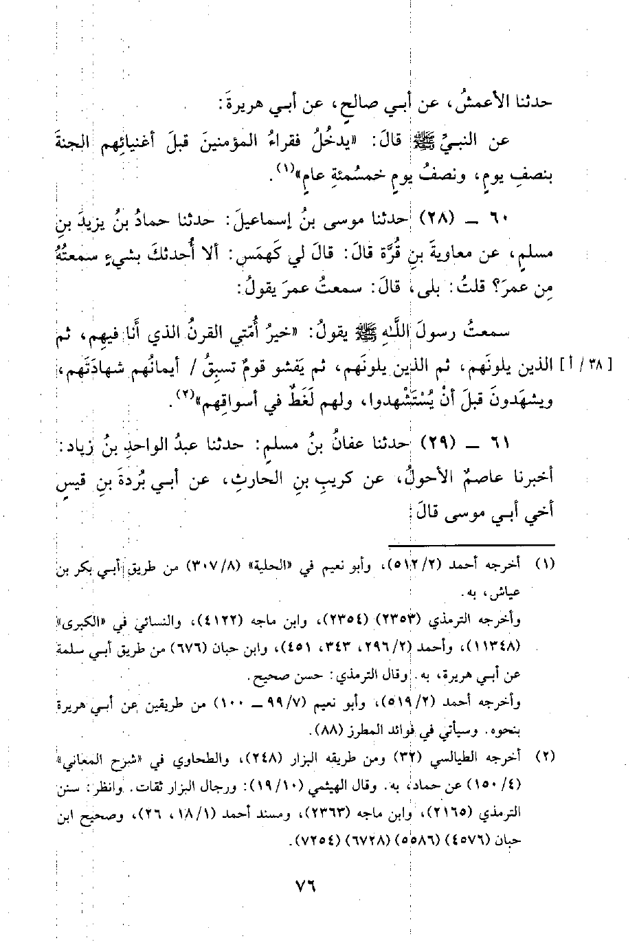 60 - (28) حدثنا موسى بن إسماعيل: حدثنا حَمَّادُ بْنُ يَزِيدَ بْنِ مُسْلِمٍ، عَنْ مُعَاوِيَةَ بْنِ قُرَّةَ قَالَ: قَالَ لِي كَهْمَسٌ: أَلا أُحَدِّثُكَ بِشَيْءٍ سَمِعْتُهُ مِنْ عُمَرَ؟ قُلْتُ: بَلَى، قَالَ: سَمِعْتُ عُمَرَ يَقُولُ: سَمِعْتُ رَسُول اللَّهِ صَلَّى اللَّهُ عَلَيْهِ وَسَلَّمَ يَقُولُ: خَيْرُ أُمَّتِي الْقَرْنُ الَّذِي أَنَا فِيهِمْ، ثُمَّ الَّذِينَ يَلُونَهُمْ، ثم الذين يلونهم، ثم يفشو قوم تسبق / أَيْمَانُهُمْ شَهَادَتَهُمْ، وَيَشْهَدُونَ قَبْلَ أَنْ يُسْتَشْهَدُوا، وَلَهُمْ لَغَطٌ فِي أسواقهم.