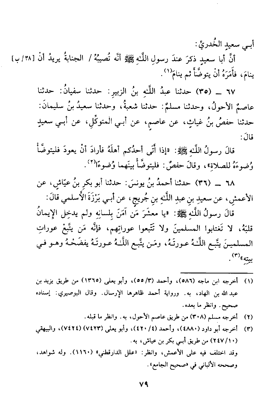 67 - (35) حدثنا عبد الله بن الزبير: حدثنا سفيان: حدثنا عاصم الأحول، وحدثنا مسلم: حدثنا شعبة، وحدثنا سعيد بن سليمان: حدثنا حَفْصُ بْنُ غِيَاثٍ، عَنْ عَاصِمٍ، عَنْ أَبِي الْمُتَوَكِّلِ، عَنْ أَبِي سَعِيدٍ قَالَ: قَالَ رَسُولُ اللَّهِ صَلَّى اللَّهُ عَلَيْهِ وَسَلَّمَ: إِذَا أَتَى أَحَدُكُمْ أَهْلَهُ فأراد أن يعود فليتوضأ وضوءه للصلاة، وقال حفص: فليتوضأ بينهما وضوءاً.