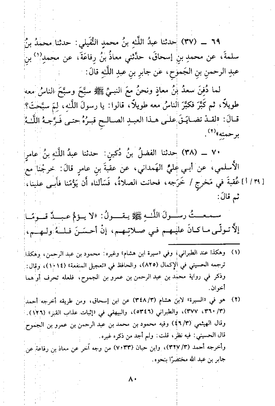 69 - (37) حدثنا عبد الله بن محمد النفيلي: حدثنا مُحَمَّدُ بْنُ سَلَمَةَ، عَنْ مُحَمَّدِ بْنِ إِسْحَاقَ، حَدَّثَنِي مُعَاذُ بْنُ رِفَاعَةَ، عَنْ مُحَمَّدِ بْنِ عَبْدِ الرَّحْمَنِ بْنِ الْجَمُوحِ، عَنْ جَابِرِ بْنِ عَبْدِ اللَّهِ قَالَ: لَمَّا دُفِنَ سَعْدُ بْنُ مُعَاذٍ وَنَحْنُ مَعَ النَّبِيّ صَلَّى اللَّهُ عَلَيْهِ وَسَلَّمَ سَبَّحَ وَسَبَّحَ النَّاسُ مَعَهُ طَوِيلا، ثُمَّ كَبَّرَ فَكَبَّرَ النَّاسُ مَعَهُ طَوِيلا، قَالُوا: يَا رَسُولَ اللَّهِ، لِمَ سَبَّحْتَ؟ قَالَ: لَقَدْ تَضَايَقَ عَلَى هَذَا الْعَبْدِ الصَّالِحِ قَبْرَهُ حَتَّى فَرَّجَهُ الله برحمته.
