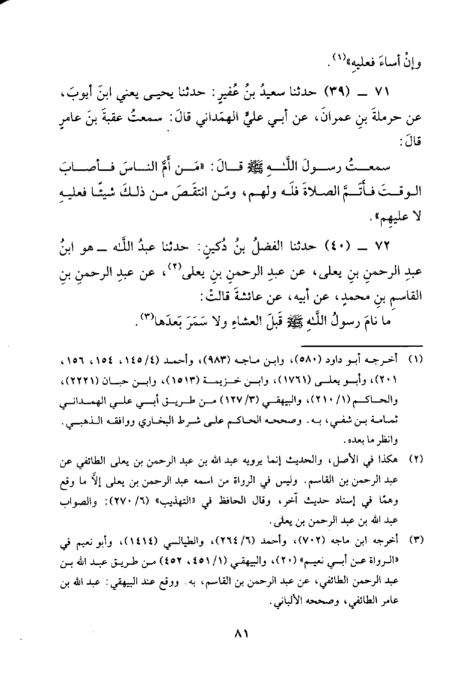71 - (39) حدثنا سعيد بن عفير: حدثنا يحيى يعني ابن أيوب، عن حرملة بن عمران، عَنْ أَبِي عَلِيٍّ الْهَمْدَانِيِّ قَالَ: سَمِعْتُ عُقْبَةَ بن عامر قَالَ: سَمِعْتُ رَسُول اللَّهِ صَلَّى اللَّهُ عَلَيْهِ وَسَلَّمَ قَالَ: من أم الناس فأصاب الوقت فأتم الصلاة فله ولهم، ومن انتقض من ذلك شيئاً فعليه لا عليهم.