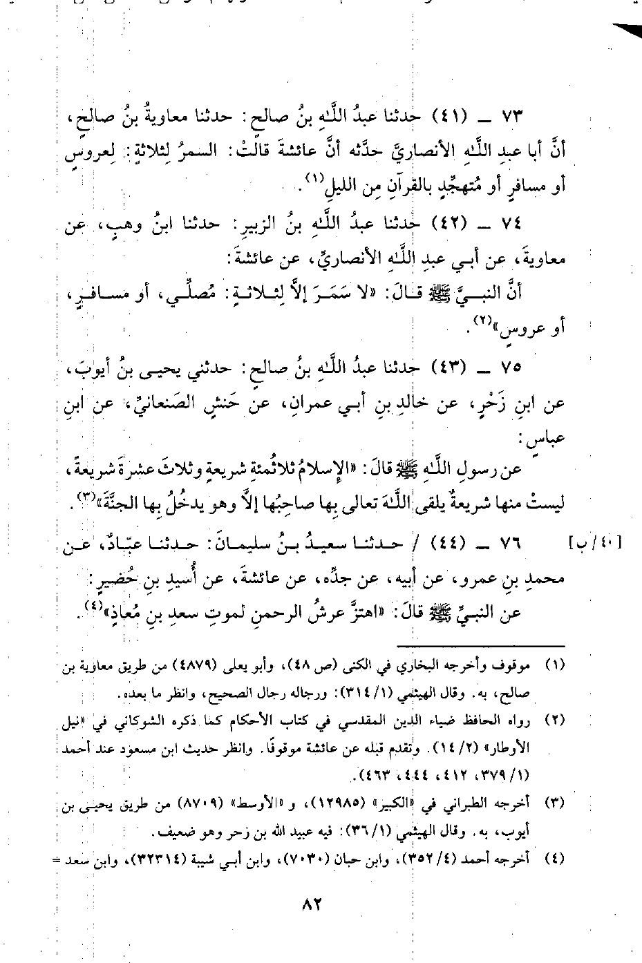 73 - (41) حدثنا عبد الله بن صالح: حدثنا مُعَاوِيَةُ بْنُ صَالِحٍ، أَنَّ أَبَا عَبْدِ اللَّهِ الأنصاري حدثه أن عائشة قالت: السمر لثلاثة: لِعَرُوسٍ أَوْ مُسَافِرٍ أَوْ مُتَهَجِّدٍ بِالْقُرْآنِ مِنَ الليل.