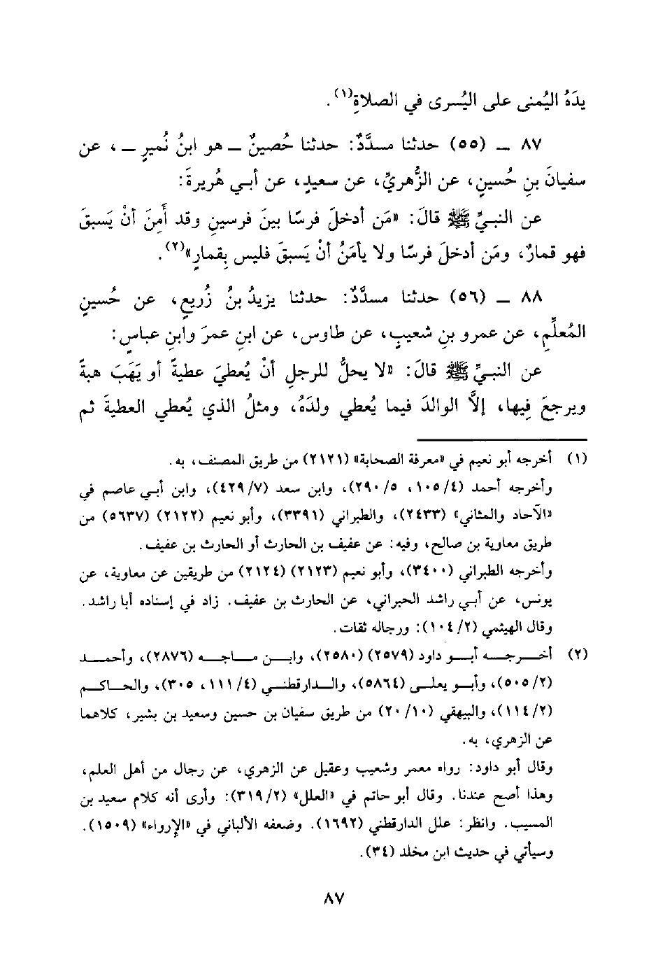 87 - (55) حدثنا مسدد: حدثنا حُصَيْنٌ - هُوَ ابْنُ نُمَيْرٍ -، عَنْ سُفْيَانُ بْنُ حُسَيْنٍ، عَنِ الزُّهْرِيِّ، عَنْ سَعِيدِ، عَنْ أَبِي هُرَيْرَةَ: عَنِ النَّبِيِّ صَلَّى اللَّهُ عَلَيْهِ وَسَلَّمَ قَالَ: مِنْ أَدْخَلَ فَرَسًا بَيْنَ فَرَسَيْنِ وَقَدْ أَمِنَ أَنْ يَسْبِقَ فَهُوَ قِمَارٌ، وَمَنْ أَدْخَلَ فَرَسًا وَلا يَأْمَنُ أَنْ يَسْبِقَ فَلَيْسَ بِقِمَارٍ.
