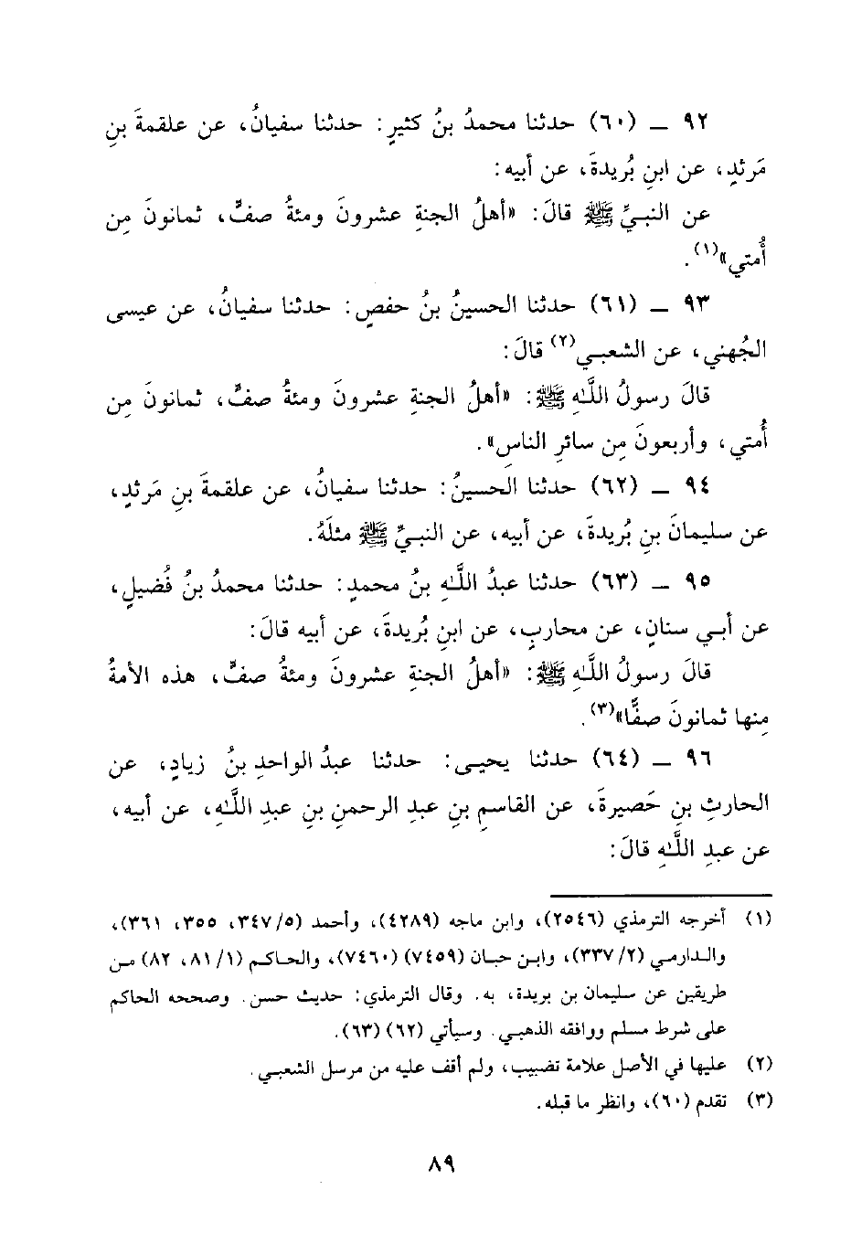 92 - (60) حَدَّثَنَا مُحَمَّدُ بْنُ كَثِيرٍ: حَدَّثَنَا سُفْيَانُ، عَنْ عَلْقَمَةَ بْنِ مَرْثَدٍ، عَنِ ابْنِ بُرَيْدَةَ، عَنْ أَبِيهِ: عَنِ النَّبِيِّ صَلَّى اللَّهُ عَلَيْهِ وَسَلَّمَ قَالَ: أهل الجنة عشرون ومئة صف، ثمانون من أمتي.
