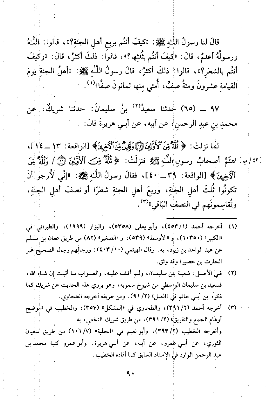 97 - (65) حَدَّثَنَا سَعِيدُ بن سليمان: حدثنا شَرِيكٌ، عَنْ مُحَمَّدِ بْنِ عَبْدِ الرَّحْمَنِ، عَنْ أَبِيهِ، عَنْ أَبِي هُرْيَرَةَ قَالَ: لَمَّا نَزَلَتْ: {ثُلَّةٌ مِنَ الأولين. وقليل من الآخرين}، اهْتَمَّ أَصْحَابَ رَسُول اللَّهِ صَلَّى اللَّهُ عَلَيْهِ وَسَلَّمَ فَنَزَلَتْ: {ثُلَّةٌ مِنَ الأَوَّلِينَ. وَثُلَّةٌ مِنَ الأخرين}، فقال رسول الله صلى الله عليه وسلم: إِنِّي لأَرْجُو أَنْ تَكُونُوا ثُلُثَ أَهْلِ الْجَنَّةِ، وَرُبُعَ أَهْلِ الْجَنَّةِ شَطْرًا أَوْ نِصْفَ أَهْلِ الْجَنَّةِ، وَتُقَاسِمُونَهُمْ فِي النِّصْفِ الْبَاقِي.