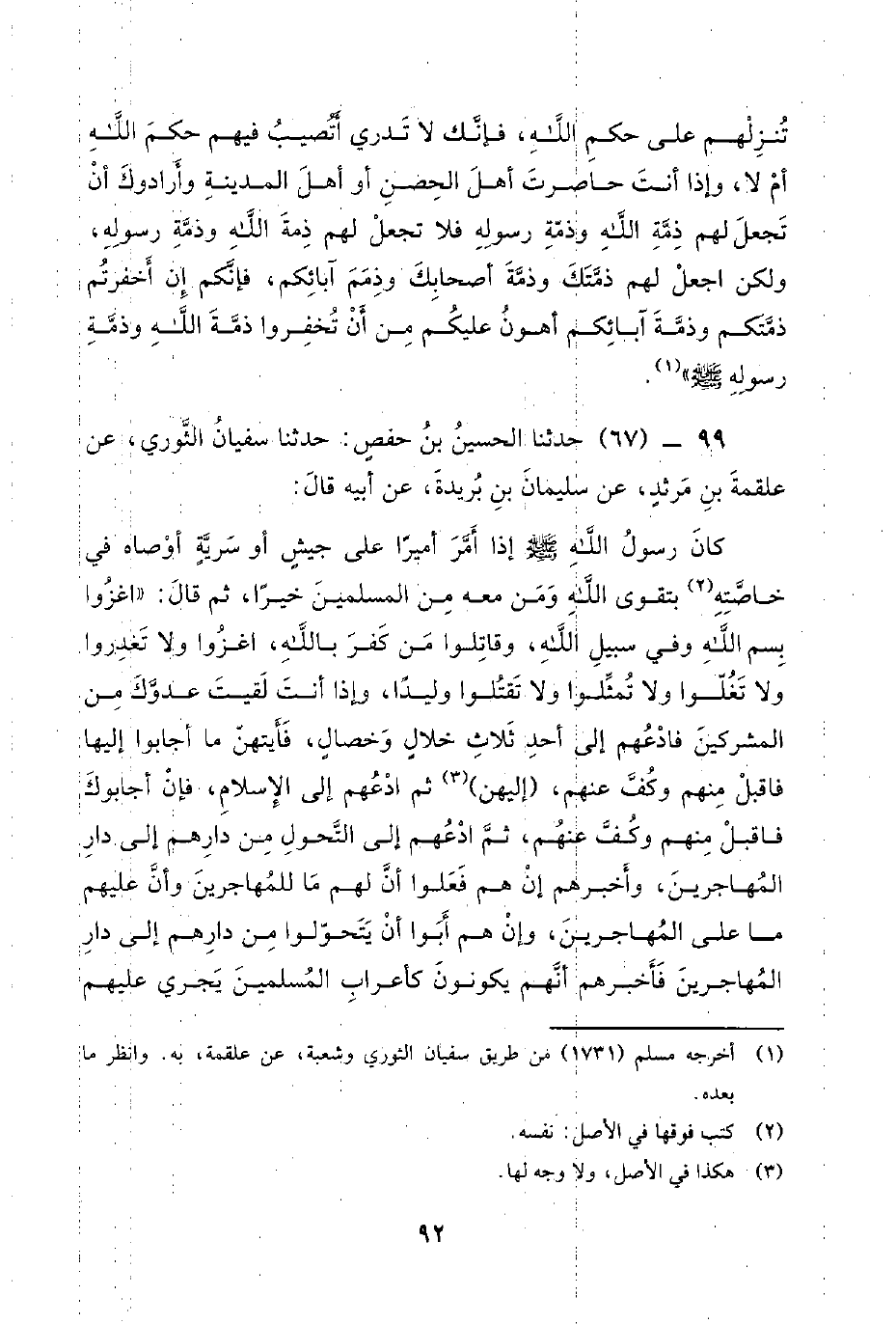 99 - (67) حدثنا الحسين بن حفص: حدثنا سُفْيَانُ الثَّوْرِيُّ، عَنْ عَلْقَمَةَ بْنِ مَرْثَدٍ، عَنْ سُلَيْمَانَ بْنِ بُرَيْدَةَ، عَنْ أَبِيهِ قَالَ: كان رسول الله صلى الله عليه وسلم إِذَا أَمَرَ أَمِيرًا عَلَى جَيْشٍ أَوْ سَرِيَّةٍ أَوْصَاهُ في خاصته بِتَقْوَى اللَّهِ وَمَنْ مَعَهُ مِنَ الْمُسْلِمِينَ خَيْرًا، ثُمَّ قَالَ: اغْزُوا بِسْمِ اللَّهِ وَفِي سَبِيلِ اللَّهِ، وَقَاتِلُوا مَنْ كَفَرَ بِاللَّهِ، اغْزُوا وَلا تَغْدُرُوا وَلا تَغْلُوا وَلا تُمَثِّلُوا وَلا تَقْتُلُوا وَلِيدًا، وَإِذَا أَنْتَ لَقِيتَ عَدُوَّكَ مِنَ الْمُشْرِكِينَ فَادْعُهُمْ إِلَى أَحَدِ ثَلاثِ خِلالٍ وَخِصَالٍ، فَأَيَّتَهُنَّ مَا أَجَابُوا إِلَيْهَا فَاقْبَلْ مِنْهُمْ وَكُفَّ عَنْهُمْ، إليهن ثم ادعهم إلى الإسلام، فإن أجابوك فاقبل منهم وكف عَنْهُمْ، ثُمَّ ادْعُهُمْ إِلَى التَّحَوُّلِ مِنْ دَارِهِمْ إِلَى دَارِ الْمُهَاجِرِينَ، وَأَخْبِرْهُمْ إِنْ هُمْ فَعَلُوا أَنَّ لَهُمْ مَا لِلْمُهَاجِرِينَ وَأَنَّ عَلَيْهِمْ مَا عَلَى الْمُهَاجِرِينَ، وَإِنْ هُمْ أَبَوْا أَنْ يَتَحَوَّلُوا مِنْ دَارِهِمْ إِلَى دَارِ الْمُهَاجِرِينَ فَأَخْبِرْهُمْ أَنَّهُمْ يَكُونُونَ كَأَعْرَابِ الْمُسْلِمِينَ يَجْرِي عَلَيْهِمْ -[93]- حُكْمُ اللَّهِ الَّذِي يَجْرِي عَلَى الْمُؤْمِنِينَ وَلا يَكُونُ لَهُمْ فِي الْفَيْءِ / وَالْغَنِيمَةِ شَيْءٌ، إِلا أَنْ يُجَاهِدُوا مَعَ الْمُسْلِمِينَ، فَإِنْ هُمْ أَبَوْا أَنْ يَدْخُلُوا فِي الإِسْلامِ فَسَلْهُمْ إِعْطَاءَ الْجِزْيَةِ، فَإِنْ فَعَلُوا فَاقْبَلْ مِنْهُمْ وَكُفَّ عَنْهُمْ، فَإِنْ أَبَوْا فَاسْتَعِنْ بِاللَّهِ وَقَاتِلْهُمْ، وَإِنْ حَاصَرْتَ أَهْلَ حِصْنٍ فَأَرَادُوكَ أَنْ تَجْعَلَ لَهُمْ ذِمَّةَ اللَّهِ وَذِمَّةَ نَبِيِّكَ صَلَّى اللَّهُ عَلَيْهِ وَسَلَّمَ فَلا تَجْعَلْ لَهُمْ ذِمَّةَ اللَّهِ وَلا ذِمَّةَ نَبِيِّكَ، وَلَكِنِ اجْعَلْ لَهُمْ ذِمَّتَكَ وَذِمَّةَ أَبِيكَ وَذِمَّةَ أَصْحَابِكَ، فَإِنَّكُمْ إِنْ تَخْفِرُوا ذِمَّتَكُمْ وَذِمَّةَ آبَائِكُمْ أَهْوَنُ عَلَيْكُمْ مِنْ أَنْ تَخْفِرُوا ذِمَّةَ اللَّهِ وَذِمَّةَ نَبِيِّكُمْ، وَإِنْ حَاصَرْتَ أَهْلَ حِصْنٍ وَأَرَادُوا أَنْ يَنْزِلُوا عَلَى حُكْمِ اللَّهِ فَلا تُنْزِلُوهُمْ عَلَى حُكْمِ اللَّهِ، وَلَكِنْ أَنْزِلُوهُمْ عَلَى حُكْمِكَ، فَإِنَّكَ لا تَدْرِي هَلْ تُصِيبُ فِيهِمْ حُكْمَ اللَّهِ تَعَالَى أَمْ لا.