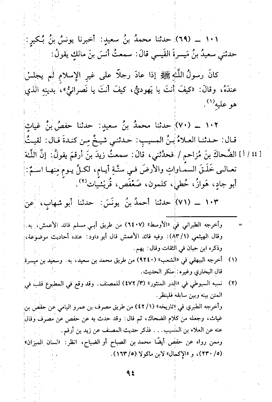 101 - (69) حدثنا محمد بن سعيد: أخبرنا يُونُسُ بْنُ بُكَيْرٍ: حَدَّثَنِي سَعِيدُ بْنُ مَيْسَرَةَ الْقَيْسِيُّ قَالَ: سَمِعْتُ أَنَسَ بْنَ مَالِكٍ يَقُولُ: كَانَ رَسُولُ اللَّهِ صَلَّى اللَّهُ عَلَيْهِ وَسَلَّمَ إِذَا عَادَ رَجُلا عَلَى غَيْرِ الإِسْلامِ لَمْ يَجْلِسْ عِنْدَهُ، وَقَالَ: كَيْفَ أَنْتَ يَا يَهُودِيُّ، كَيْفَ أَنْتَ يَا نَصْرَانِيُّ، بِدِينِهِ الَّذِي هُوَ عليه.