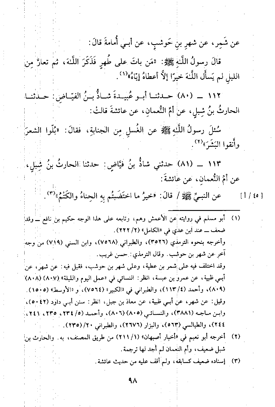 112 - (80) حدثنا أبو عبيدة شاذ بن الفياض: حدثنا الْحَارِثُ بْنُ شِبْلٍ، عَنْ أُمِّ النُّعْمَانِ، عَنْ عَائِشَةَ قَالَتْ: سُئِلَ رَسُول اللَّهِ صَلَّى اللَّهُ عَلَيْهِ وَسَلَّمَ عَنْ الْغُسْلِ مِنَ الْجَنَابَةِ، فَقَالَ: بِلُّوا الشَّعْرَ وَانْقُوا الْبَشْرَ.