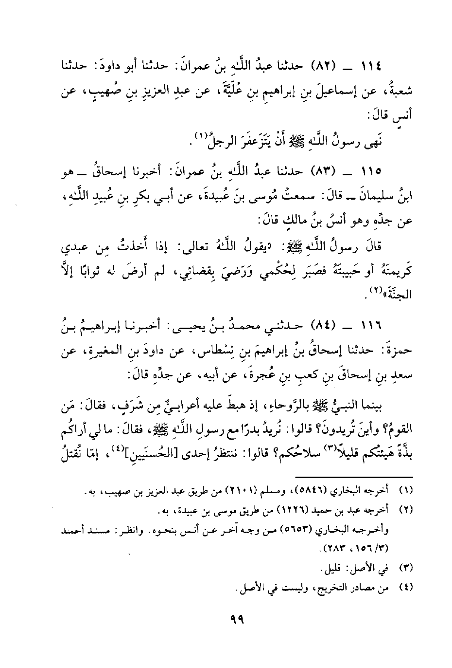 116 - (84) حدثني محمد بن يحيى: أخبرنا إبراهيم بن حمزة: حدثنا إِسْحَاقُ بْنُ إِبْرَاهِيمَ بْنِ نِسْطَاسٍ، عَنْ دَاوُدَ بْنِ الْمُغِيرَةِ، عَنْ سَعْدِ بْنِ إِسْحَاقَ بْنِ كَعْبِ بْنِ عُجْرَةَ، عَنْ أَبِيهِ، عَنْ جَدِّهِ قَالَ: بَيْنَمَا النَّبِيّ صَلَّى اللَّهُ عَلَيْهِ وَسَلَّمَ بِالرَّوْحَاءِ، إِذْ هَبَطَ عَلَيْهِ أَعْرَابِيٌّ مِنْ شُرُفٍ، فَقَالَ: مَنِ الْقَوْمُ؟ وَأَيْنَ تُرِيدُونَ؟ قَالُوا: نُرِيدُ بَدْرًا مَعَ رَسُول اللَّهِ صَلَّى اللَّهُ عَلَيْهِ وَسَلَّمَ، فَقَالَ: مَا لِيَ أَرَاكُمْ بَذَّةٌ هَيْئَتُكُمْ قليلا سلاحكم؟ قالوا: ننتظر إحدى [الحسنيين]، إما نقتل -[100]- فَلَنَا الْجَنَّةُ، وَإِمَّا نَغْلِبُ فَيَجْمَعَهُمَا اللَّهُ لَنَا الظَّفَرَ وَالْجَنَّةَ، قَالَ: أَيْنَ نَبِيُّكُمْ صَلَّى اللَّهُ عليه وسلم؟ قالوا: ها هو ذا، فَجَاءَهُ فَقَالَ: أَيْ نَبِيَّ اللَّهِ، إِنِّي لَيْسَتْ مَعِيَ مَصْلَحَةٌ، آخُذُ مَصْلَحَتِي ثُمَّ أَلْحَقُ بِكَ، قَالَ: اذْهَبْ إِلَى أَهْلَكِ وَخُذْ مَصْلَحَتَكَ، فَخَرَجَ رَسُول اللَّهِ صَلَّى اللَّهُ عَلَيْهِ وَسَلَّمَ يَوْمٌ بدر وَخَرَجَ الرَّجُلُ إِلَى أَهْلِهِ حَتَّى فَرَغَ مِنْ حاجته، ثم لَحِقَ بِرَسُولِ اللَّهِ صَلَّى اللَّهُ عَلَيْهِ وَسَلَّمَ ببدر وهو يصف الناس للقتال [فدخل في الصف، فكان ممن إستشهده الله عز وجل، فَقَالَ رَسُولُ اللَّهِ صَلَّى اللَّهُ عَلَيْهِ وَسَلَّمَ لعمر: يا عمر، إن للشهداء سادة وأشرافاً وملوكا، وإن هذا يا عمر منهم].