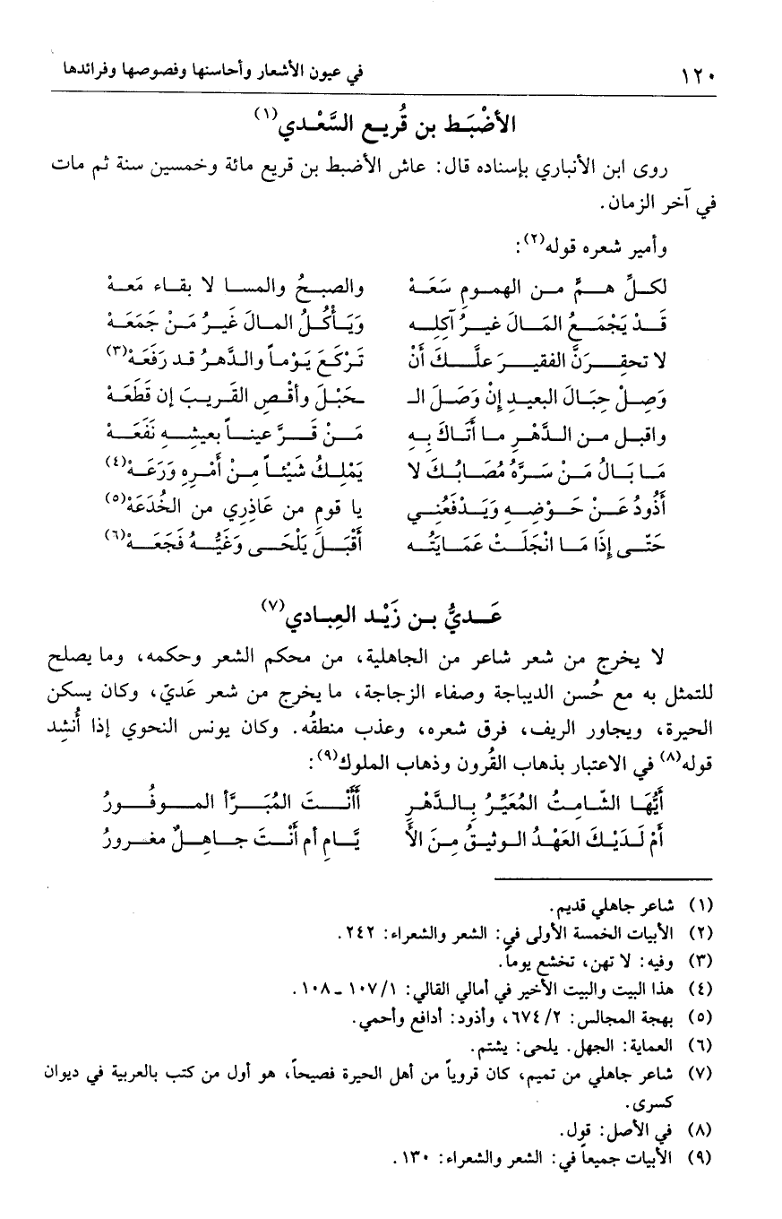 لا يخرج من شعر شاعر من الجاهلية، من محكم الشعر وحكمه، وما يصلح للتمثل به مع حُسن الديباجة وصفاء الزجاجة، ما يخرج من شعر عَديّ، وكان يسكن الحيرة، ويجاور الريف، فرق شعره، وعذب منطقُه. وكان يونس النحوي إذا أُنشِد قوله في الاعتبار بذهاب القُرون وذهاب الملوك: