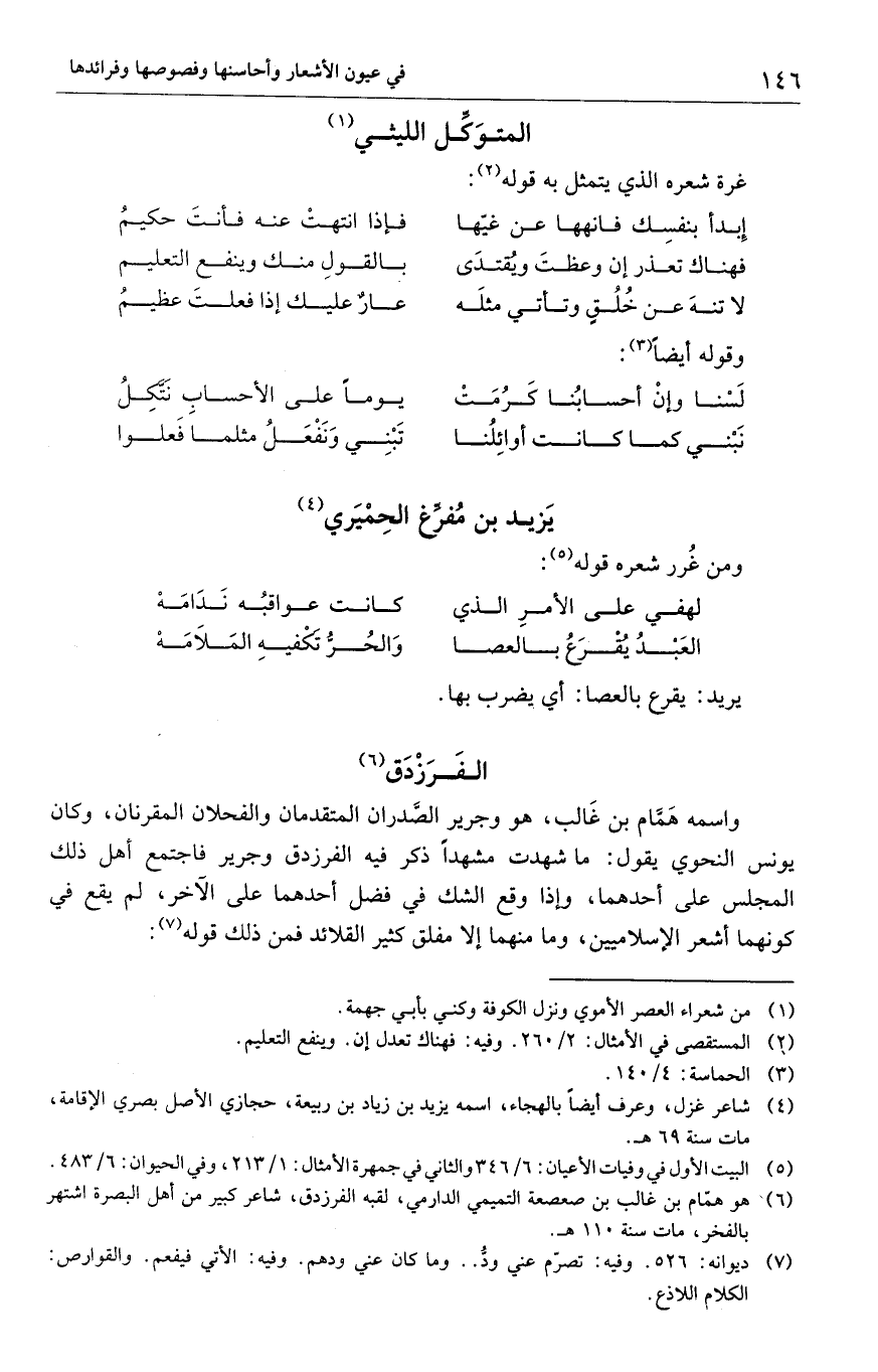 الفرزدق وجرير فاجتمع آهل ذلك المجلس على أحدهما، وإذا وقع الشك في فضل أحدهما على الآخر، لم يقع في كونهما أشعر الإسلاميين، وما منهما إلا مفلق كثير القلائد فمن ذلك قوله: