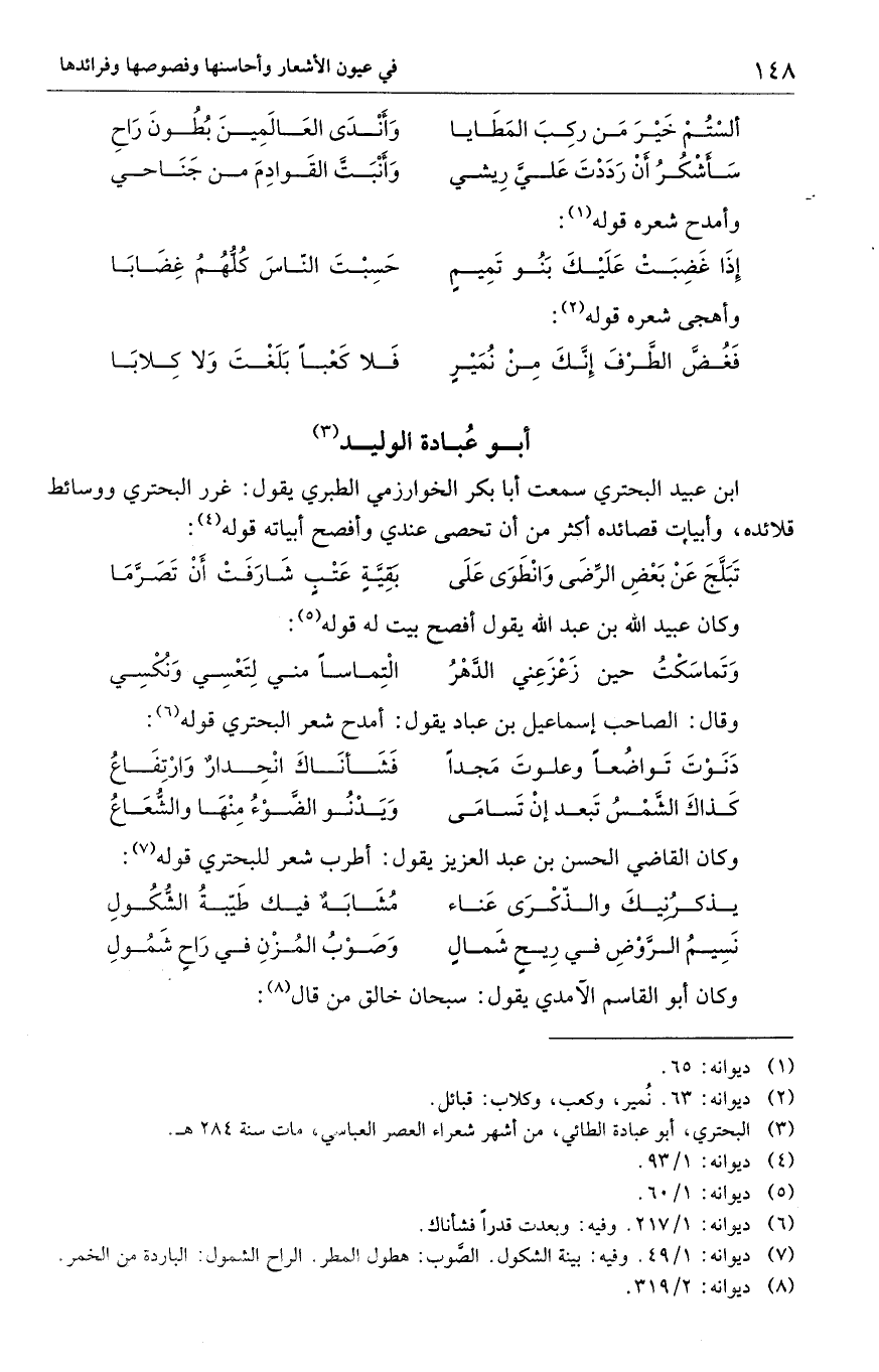 ابن عبيد البحتري سمعت أبا بكر الخوارزمي الطبري يقول: غرر البحتري ووسائط قلائده، وأبيات قصائده أكثر من أن تحصى عندي وأفصح أبياته قوله: