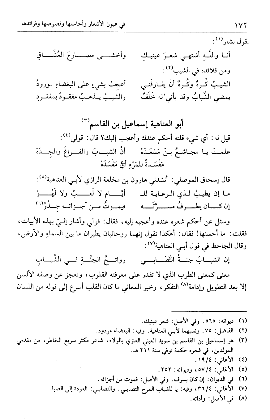 وسئل عن أحكم شعره عنده وأعجبه إليه، فقال: قولي وأشار إليّ بهذه الأبيات، فقلت: ما أحسنها! فقال: أهكَذا تقول إنهما روحانيان يطيران ما بين السماءِ والأرض، وقال الجاحظ في قول أبي العتاهية: