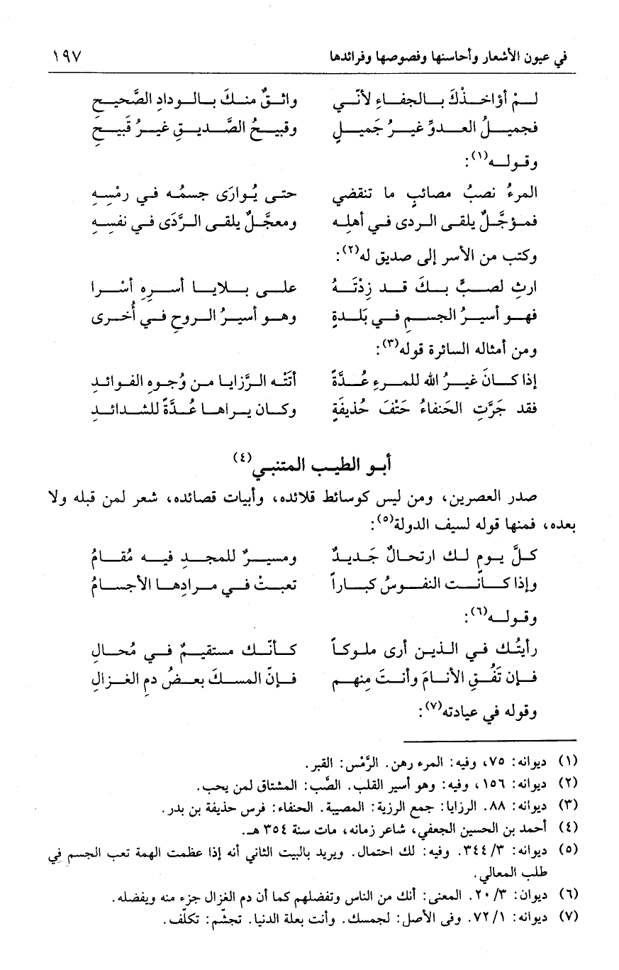 صدر العصرين، ومن ليس كوسائط قلائده، وأبيات قصائده، شعر لمن قبله ولا بعده، فمنها قوله لسيف الدولة:
