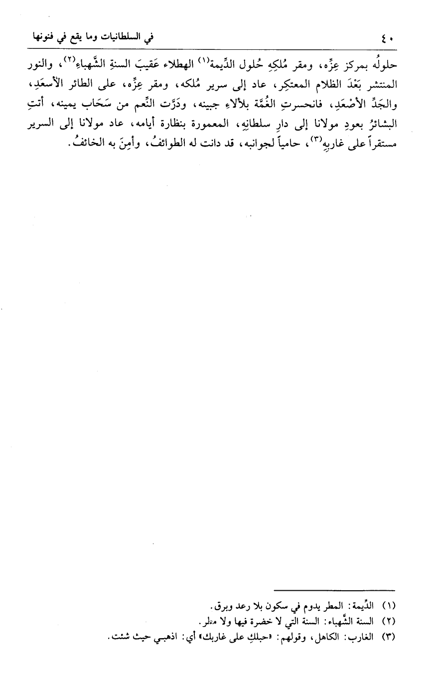 حلولُه بمركز عِزِّه، ومقر مُلكِهِ حُلول الدِّيمة الهطلاء عَقيبَ السنةِ الشَهباء، والنور المنتشر بَعْدَ الظلام المعتكِر، عاد إلى سرير مُلكه، ومقر عِزه، على الطائر الأسعَدِ، والجَدِّ الأصْعَدِ، فانحسرتِ الغُمَّة بلألاء جبينه، ودرَّت النَّعم من سَحَاب يمينه، أتتِ البشائرُ بعودِ مولانا إلى دارِ سلطانِهِ، المعمورة بنظارة أيامه، عاد مولانا إلى السرير مستقراً على غاربِهِ، حامياً لجوانبه، قد دانت له الطوائْفُ، وأمِنَ به الخائفُ.