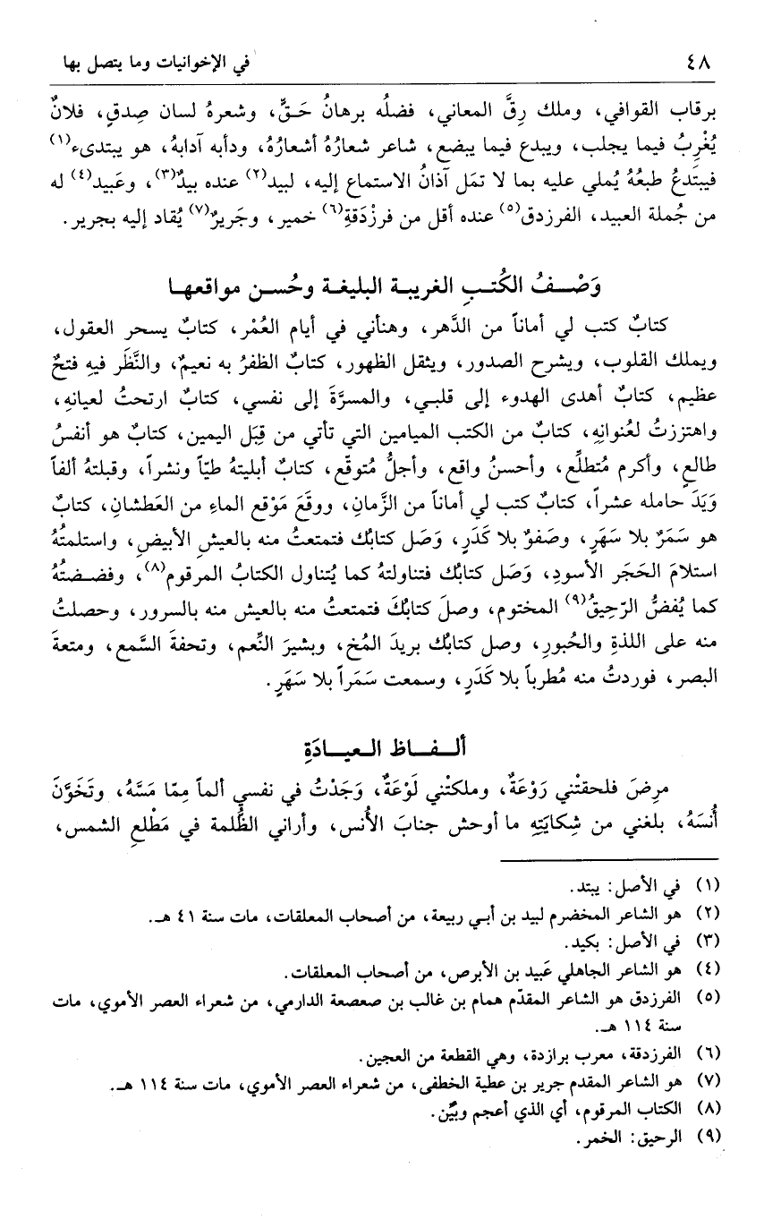 كتابٌ كتب لي أماناً من الدَّهر، وهنأني في أيام العُمْر، كتاب يسحر العقول، ويملك القلوب، ويشرح الصدور، ويثقل الظهور، كتابٌ الظفرُ به نعيمٌ، والنَّظَر فيه فتح عظيم، كتابٌ أهدى الهدوء إلى قلبي، والمسرَّةَ إلى نفسي، كتابٌ ارتحتُ لعيانهِ، واهتززتُ لعُنوانِهِ، كتابٌ من الكتب الميامين التي تأتي من قِبَل اليمين، كتابٌ هو أنفسُ طالعٍ، وأكرم مُتطلِّع، وأحسنُ واقع، وأجلُّ مُتوقع، كتاب أبليتهُ طياً ونشراً، وقبلتهُ ألفاً وَيَدَ حامله عشراً، كتابٌ كتب لي أماناً من الزمانِ، ووقَعَ مَوْقع الماء من العَطشانِ، كتابٌ هو سَمَرٌ بلا سَهَرٍ، وصَفوٌ بلا كَدَرٍ، وَصَل كتابك فتمتعتُ منه بالعيشِ الأبيضِ، واستلمتُهُ استلامَ الحَجَر الأسودِ، وَصَل كتابك فتناولتهُ كما يُتناول الكتابُ المرقوم، وفضضتُهُ كما يُفض الرّحِيقُ المختوم، وصلَ كتابك فتمتعتُ منه بالعيش منه بالسرور، وحصلتُ منه على اللذةِ والحُبورِ، وصل كتابك بريدَ المُخ، وبشيرَ النعم، وتحفةَ السَّمع، ومتعةَ البصر، فوردتُ منه مُطرباً بلا كَدَرٍ، وسمعت سَمَراً بلا سَهَرٍ.