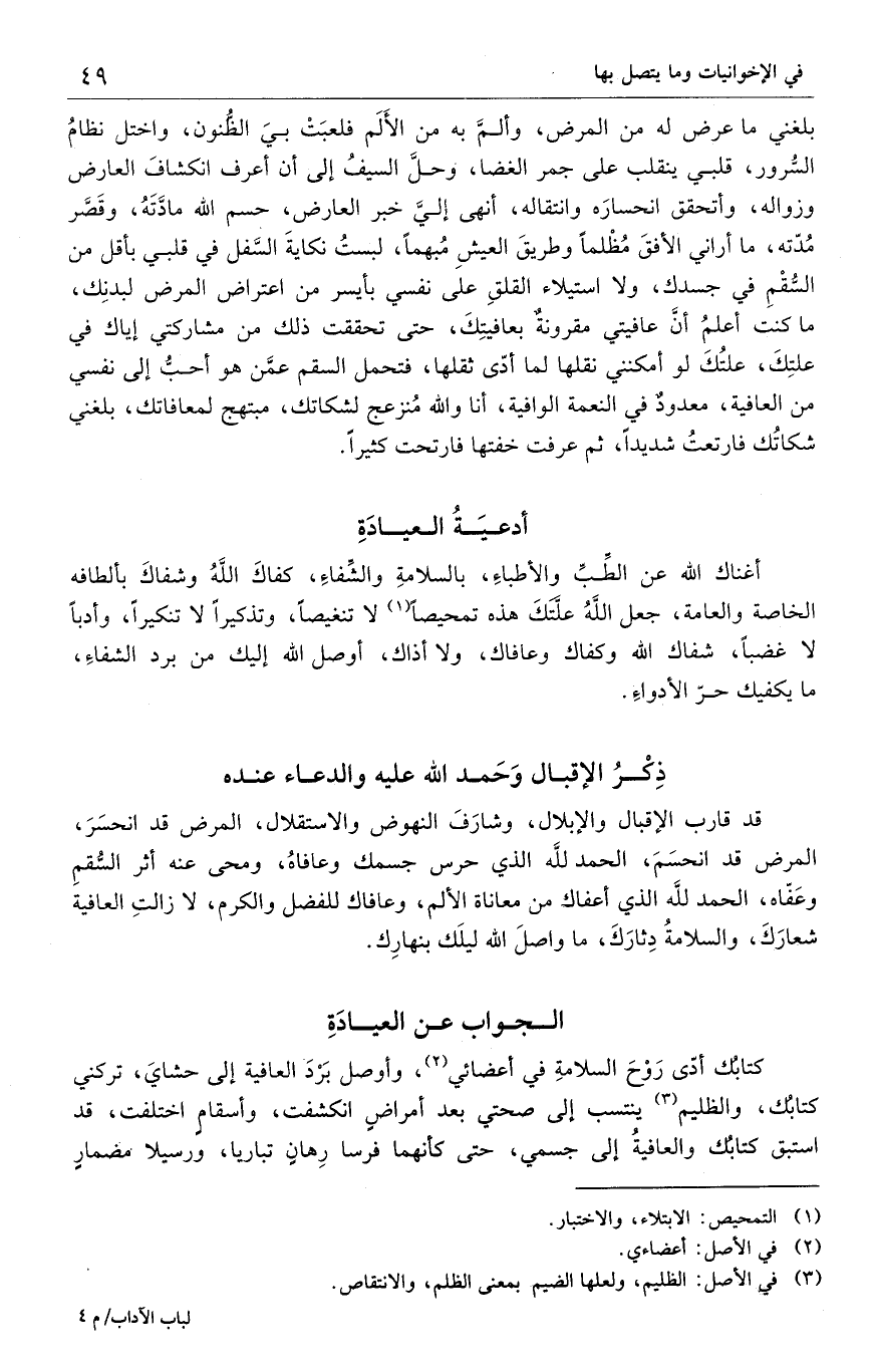 بلغني ما عرض له من المرض، وألمَّ به من الأَلَم فلعبَتْ بيَ الظنون، واختل نظام السرور، قلبي ينقلب على جمر الغضا، وحلَّ السيفُ إلى أن أعرف انكشافَ العارض وزواله، وأتحقق انحسارَه وانتقاله، أنهى إليَ خبر العارض، حسم الله مادَتَهُ، وقصر مُدّته، ما أراني الأفقَ مظلماً وطريقَ العيشِ مُبهماً، لبستُ نكايةَ السَّفل في قلبي بأقلْ من السُّقْمِ في جسدك، ولا استيلاء القلقِ على نفسي بأيسر من اعتراض المرض لبدنك ما كنت أعلمُ أن عافيتي مقرونة بعافيتِكَ، حتى تحققت ذلك من مشاركتي إياك في علتِكَ، علتُكَ لو أمكنني نقلها لما أدى ثقلها، فتحمل السقم عمَن هو أحبُّ إلى نفسي من العافية، معدودٌ في النعمة الوافية، أنا والله مُنزعج لشكاتك، مبتهج لمعافاتك، بلغني شكاتُك فارتعتُ شديداً، ثم عرفت خفتها فارتحت كثيراً.