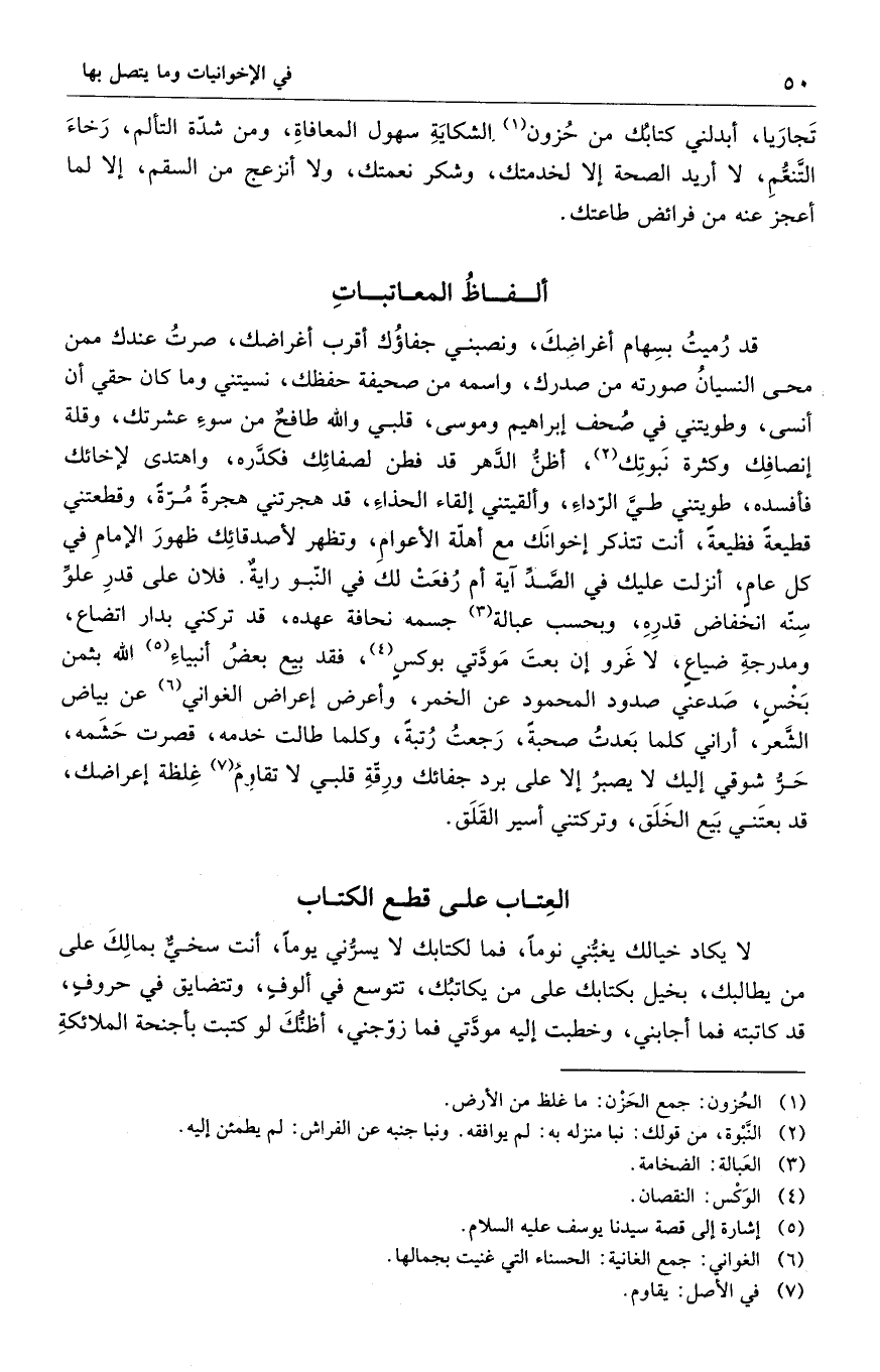 قد رُميتُ بسِهام أغراضكَ، ونصبني جفاؤُك أقرب أغراضك، صرتُ عندك ممن محى النسيانُ صورته من صدرك، واسمه من صحيفة حفظك، نسيتني وما كان حقي أن أنسى، وطويتني في صُحف إبراهيم وموسى، قلبي والله طافح من سوءِ عشرتك، وقلة إنصافِك وكثرة نَبوتِك، أظنُّ الدهر قد فطن لصفائِك فكدَّره، واهتدى لإخائك فأفسده، طويتني طيَّ الرّداءِ، وألقيتني إلقاء الحذاءَ، قد هجرتني هجرةً مُرّةً، وقطعتني قطيعةً فظيعةً، أنت تتذكر إخوانَك مع أهلّة الأعوامِ، وتظهر لأصدقائِك ظهورَ الإمامِ في كل عام، أنزلت عليك في الصََّدّ آية أم رُفعَتْ لك في النّبو رايةٌ. فلان على قدرِ علوّ سِنّه انخفاض قدرِهِ، وبحسب عبالة جسمه نحافة عهده، قد تركني بدار اتضاع، ومدرجةِ ضياعٍ، لا غَرو إن بعتَ مَودَّتي بوكسٍ، فقد بيع بعضُ أنبياءِ الله بثمن بَخْسٍ، صَدعني صدود المحمودٍ عن الخمر، وأعرض إعراض الغواني عن بياض الشَعر، أراني كلما بَعدتُ صحبة، رَجعتُ رُتبةً، وكلما طالت خدمه، قصرت حَشَمه، حَزُ شوقي إليك لا يصبرُ إلا على برد جفائك ورِقّةِ قلبي لا تقاوم غِلظة إعراضك، قد بعتَني بَيع الخَلَق، وتركتني أسير القَلَق.
