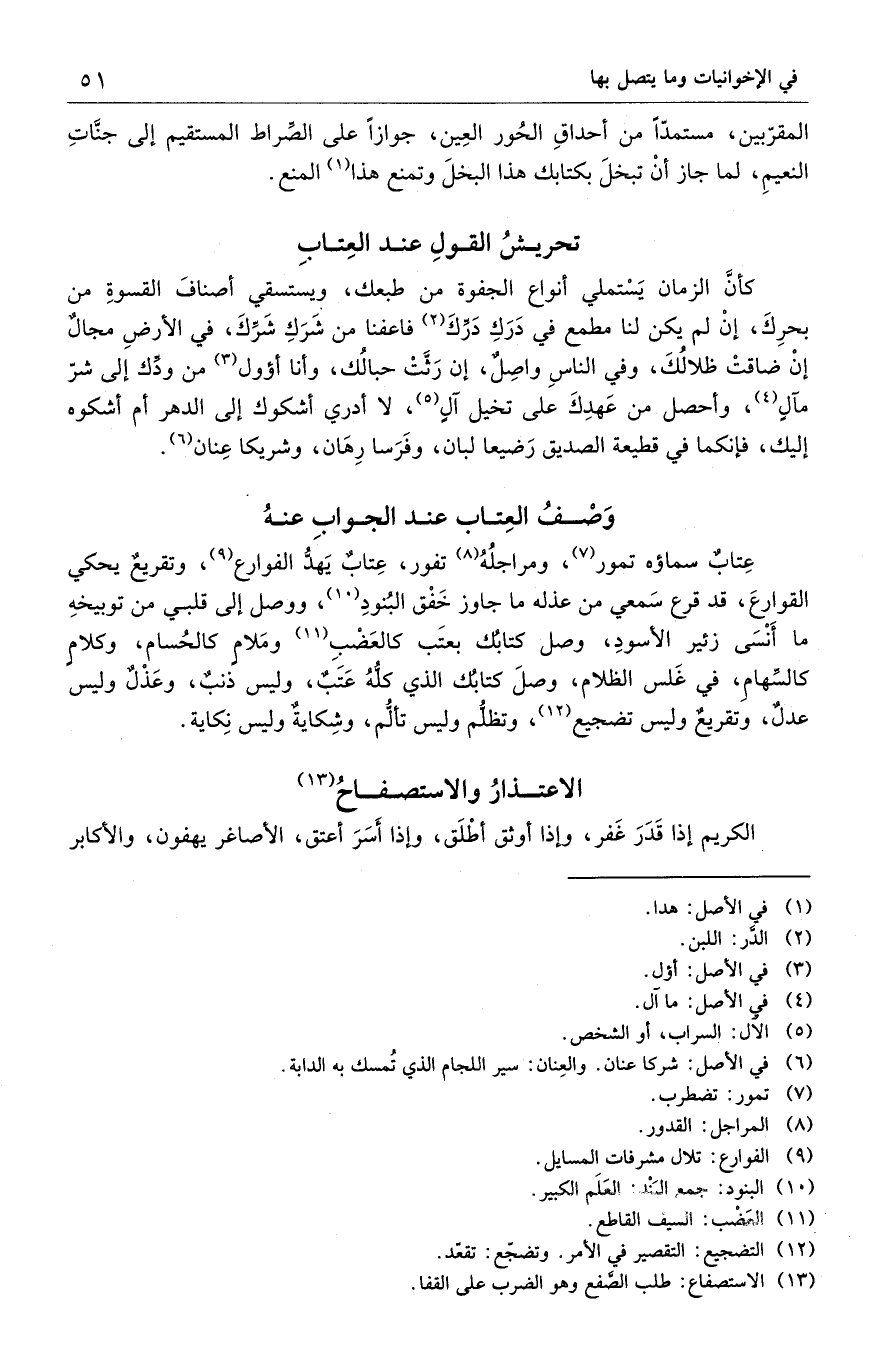 عِتابٌ سماؤه تمور، ومراجلُهُ تفور، عِتابٌ يَهدُّ الفوارع، وتقريعٌ يحكي القوارعَ، قد قرع سَمعي من عذله ما جاوز خَفْق البُنودِ، ووصل إلى قلبي من توبيخه ما أَنْسَى زئير الأسودِ، وصل كتابك بعتَب كالعَضبِ ومَلام كالحُسام، وكلام كالسِّهامِ، في غَلس الظلام، وصلَ كتابك الذي كلُهُ عَتَب، وليس ذنبٌ، وعَذْلُ وليس عدلٌ، وتقريعٌ وليس تضجيع، وتظلُّم وليس تألُّم، وشِكايةٌ وليس نِكاية.