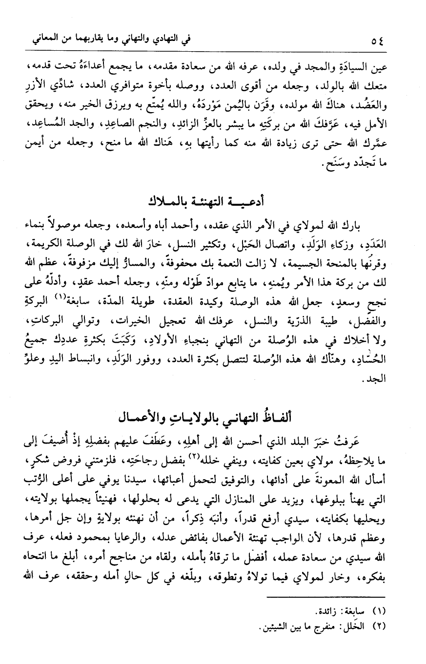 بارك الله لمولاي في الأمر الذي عقده، وأحمد أباه وأسعده، وجعله موصولاً بنماء العدد، وزكاء الوَلَدِ، واتصال الحَبْل، وتكثير النسل، خارَ الله لك في الوصلة الكريمة، وقرنها بالمنحة الجسيمة، لا زالت النعمة بك محفوفةً، والمسارُّ إليك مزفوفةً، عظم الله لك بركة هذا الأمر ويُمنهِ، ما يتابع موادّ طَوْله ومنهِ، وجعله أحمد عقدٍ، وأدلّهُ على نجح وسعدٍ، جعل الله هذه الوصلة وكيدة العقدة، طويلة المدة، سابغة البركةِ والفضل، طيبة الذرية والنسل، عرفك الله تعجيل الخيرات، وتوالي البركاتِ، ولا أخلاك في هذه الوُصلة من التهاني بنجباءِ الأولادِ، وَكَبَتَ بكثرةِ عددِك جميعُ الحسادِ، وهنّأك الله هذه الوُصلة لتتصل بكثرة العدد، ووفور الوَلَدِ، وانبساط اليدِ وعلوّ الجد.
