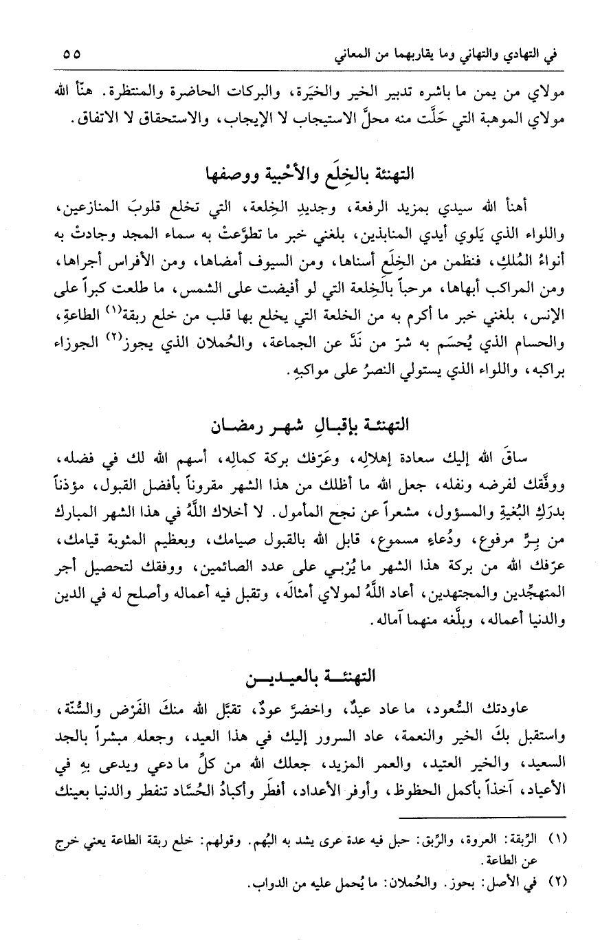 مولاي من يمن ما باشره تدبير الخير والخيَرة، والبركات الحاضرة والمنتظرة. هنأ الله مولاي الموهبة التي حَلَّت منه محلَّ الاستيجاب لا الإيجاب، والاستحقاق لا الاتفاق.