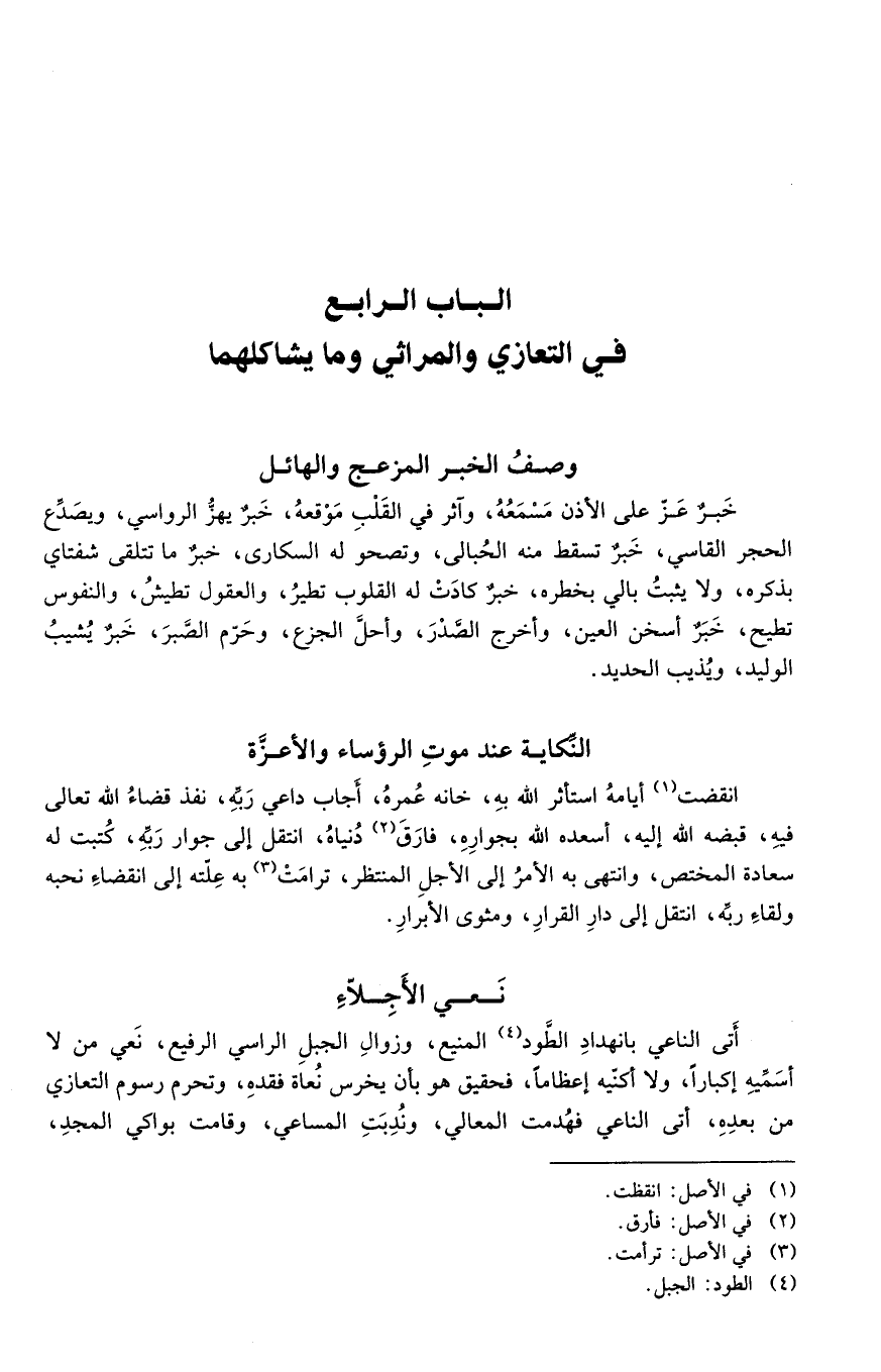 أَتى الناعي بانهدادِ الطَود المنيع، وزوالِ الجبلِ الراسي الرفيع، نَعي من لا أسَمِّيه إكباراً، ولا أكنيه إعظاماً، فحقيق هو بأن يخرس نُعاة فقدهِ، وتحرم رسوم التعازي من بعدِهِ، أتى الناعي فهُدمت المعالي، ونُدِبَتِ المساعي، وقامت بواكي المجدِ،