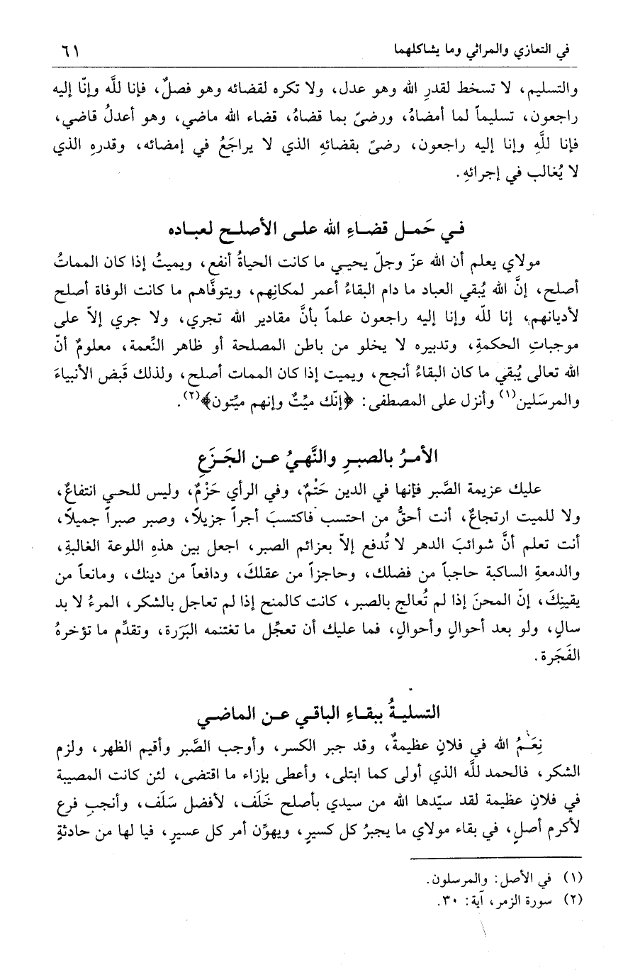 عليك عزيمة الصَّبر فإنها في الدين حَتْمٌ، وفي الرأي حَزْمٌ، وليس للحي انتفاعٌ، ولا للميت ارتجاعٌ، أنت أحق من احتسب فاكتسبَ أجراً جزيلاً، وصبر صبراً جميلاً، أنت تعلم أنَّ شوائبَ الدهر لا تُدفع إلاّ بعزائم الصبر، اجعل بين هذهِ اللوعة الغالبةِ. والدمعةِ الساكبة حاجباً من فضلك، وحاجزاً من عقلكَ، ودافعاً من دينك، ومانعاً من يقينِكَ، إنّ المحنَ إذا لم تُعالج بالصبر، كانت كالمنح إذا لم تعاجل بالشكر، المرءُ لا بد سالٍ، ولو بعد أحوالِ وأحوالٍ، فما عليك أن تعجِّل ما تغتنمه البَرَرة، وتقدِّم ما تؤخر الفَجَرة.