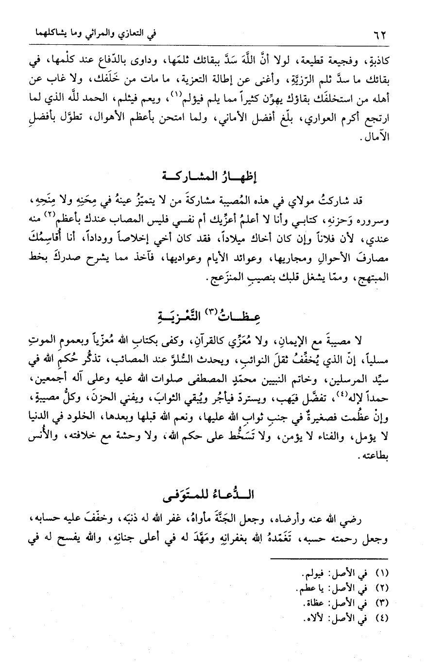 قد شاركتُ مولاي في هذه المُصيبة مشاركةَ من لا يتميّزُ عينهُ في مِحَنِهِ ولا مِنَحِهِ، وسروره وَحزنهِ، كتابي وأنا لا أعلمُ أعزيك أم نفسي فليس المصاب عندك بأعظم منه عندي، لأن فلاناً وإن كان أخاك ميلاداً، فقد كان أخي إخلاصاً ووداداً، أنا أُقاسمُكَ مصارفَ الأحوالِ ومجاريها، وعوائد الأيام وعواديها، فآخذ مما يشرح صدركَ بخط المبتهج، وممّا يشغل قلبك بنصيبِ المنزَعج.