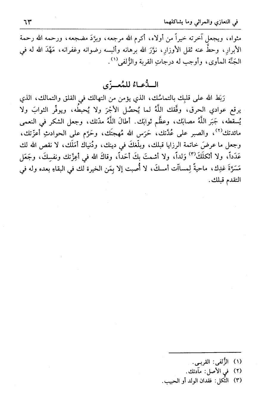 رَبطَ الله على قلبِك بالتماسُك، الذي يؤمن من التهالك في القلق والتمالك، الذي يرقع عوادي الحرق، وفَّقك اللَهُ لما يُحصَل الأجْرَ ولا يُحبطُه، ويوفِّر الثوابَ ولا يُسقطه، جَبَر اللَّهُ مصابك، وعظم ثوابك. أطالَ اللَّهُ مدّتك، وجعل الشكر في النعمى مائدتك، والصبر على عُدَّتك، حَرَس الله مُهجتَك، وحَرَّم على الحوادثِ أعزّتك، وجعل ما عرضَ خاتمة الرزايا قبلك، وبلِّغكَ في دينك، ودُنياك أمَلَك، لا نقص الله لك عَدَداً، ولا أثكلَكَ وَلداً، ولا أشمتَ بكَ أحَداً، وقاكَ الله في أعِزَّتك ونفسِكَ، وجَعَل مَسَرَةَ غدك، ماحيةً لِمساآت أمسكَ، لا أصبت إلا بِمَن الخيرة لك في البقاء بعده وله في التقدم قبلك.