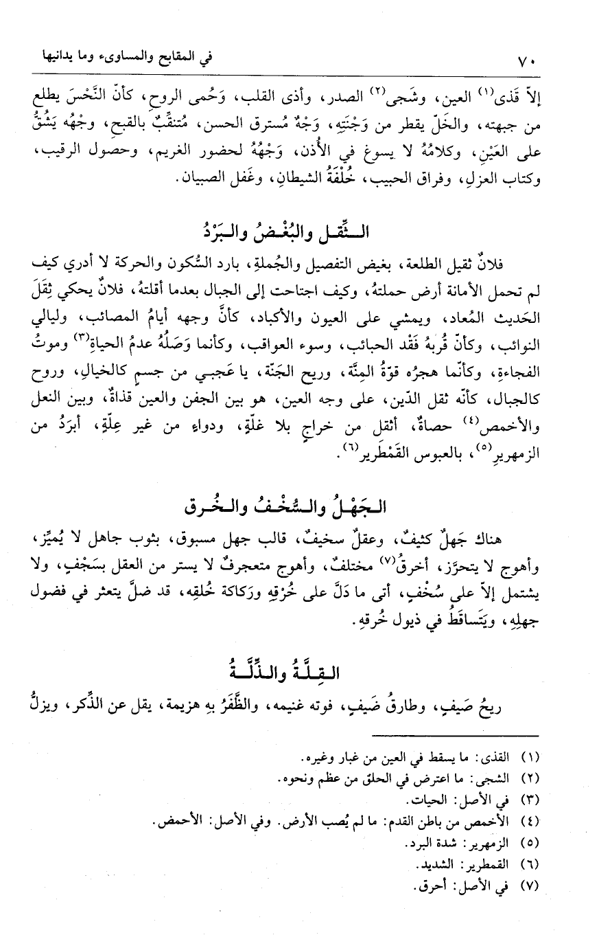 فلانٌ ثقيل الطلعة، بغيض التفصيل والجُملةِ، بارد السُّكون والحركة لا أدري كيف لم تحمل الأمانة أرض حملتهُ، وكيف اجتاحت إلى الجبال بعدما أقلتهُ، فلان يحكي ثِقَلَ الحَديث المُعاد، ويمشي على العيون والأكباد، كأنَ وجهه أيامُ المصائب، وليالي النوائب، وكأنّ قُربهُ فَقْد الحبائب، وسوء العواقب، وكأنما وَصَلُةُ عدمُ الحياةِ وموتُ الفجاءةِ، وكأنّما هجره قوّةُ المِنَة، وريح الجَنّة، يا عَجبي من جسمٍ كالخيالِ، وروح كالجبال، كأنّه ثقل الدّين، على وجه العين، هو بين الجفن والعين قذاة، وبين النعل والأخمص حصاةٌ، أثقل من خراجٍ بلا غلّةٍ، ودواءً من غير عِلّةٍ، أبرَدُ من الزمهريرِ، بالعبوس القَمْطَرير.