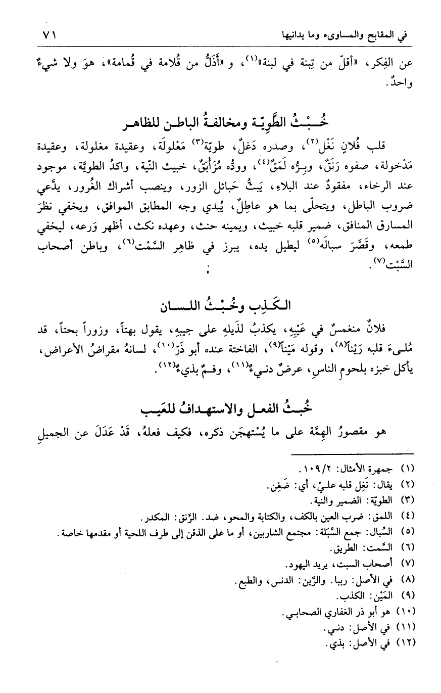 قلب فلانٍ نَغْل، وصدره دَغلٌ، طوية مَعْلولَة، وعقيدة مغلولة، وعقيدة مدْخولة، صفوه رَنَقٌ، وبِرُّه لَمَقٌ، وودُّه مُزَأبقٌ، خبيث النّية، واكدُ الطويَّة، موجود عند الرخاء، مفقود عند البلاءَ، يَبثُّ حَبائل الزور، وينصب أشراك الغرور، يدَّعي ضروب الباطل، ويتحلّى بما هو عاطِلٌ، يُبدي وجه المطابق الموافق، ويخفي نظرَ المسارق المنافق، ضمير قلبه خبيث، ويمينه حنث، وعهده نكث، أظهر وَرعه، ليخفي طمعه، وقَصَّرَ سبالَه ليطيل يده، يبرز في ظاهِر السَّمْت، وباطن أصحاب السَّبْت.