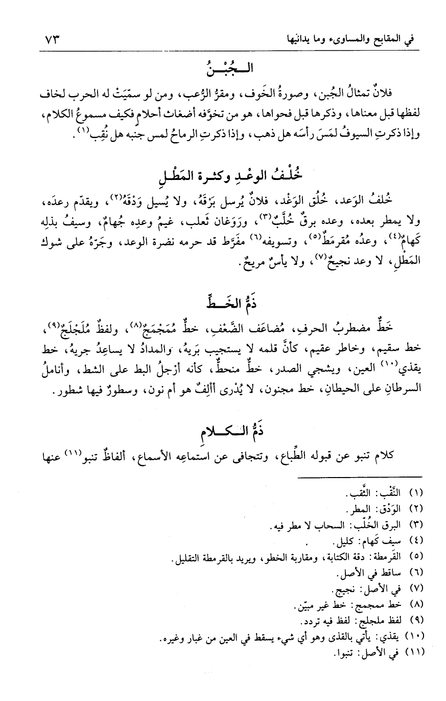 خَطّ مضطربُ الحرفِ، مُضاعَف الضَعْفِ، خطٌّ مُمَجْمَجٌ، ولفظٌ مُلَجْلجٌ خط سقيم، وخاطر عقيم، كأن قلمه لا يستجيب برَيهُ، والمدادُ لا يساعِدُ جريهُ خط يقذي العين، ويشجي الصدر، خط منحطٌّ، كأنه أرْجلُ البط على الشط، وأنامل السرطانِ على الحيطانِ، خط مجنون، لا يُدْرى أألِف هو أم نون، وسطورٌ فيها شطور.