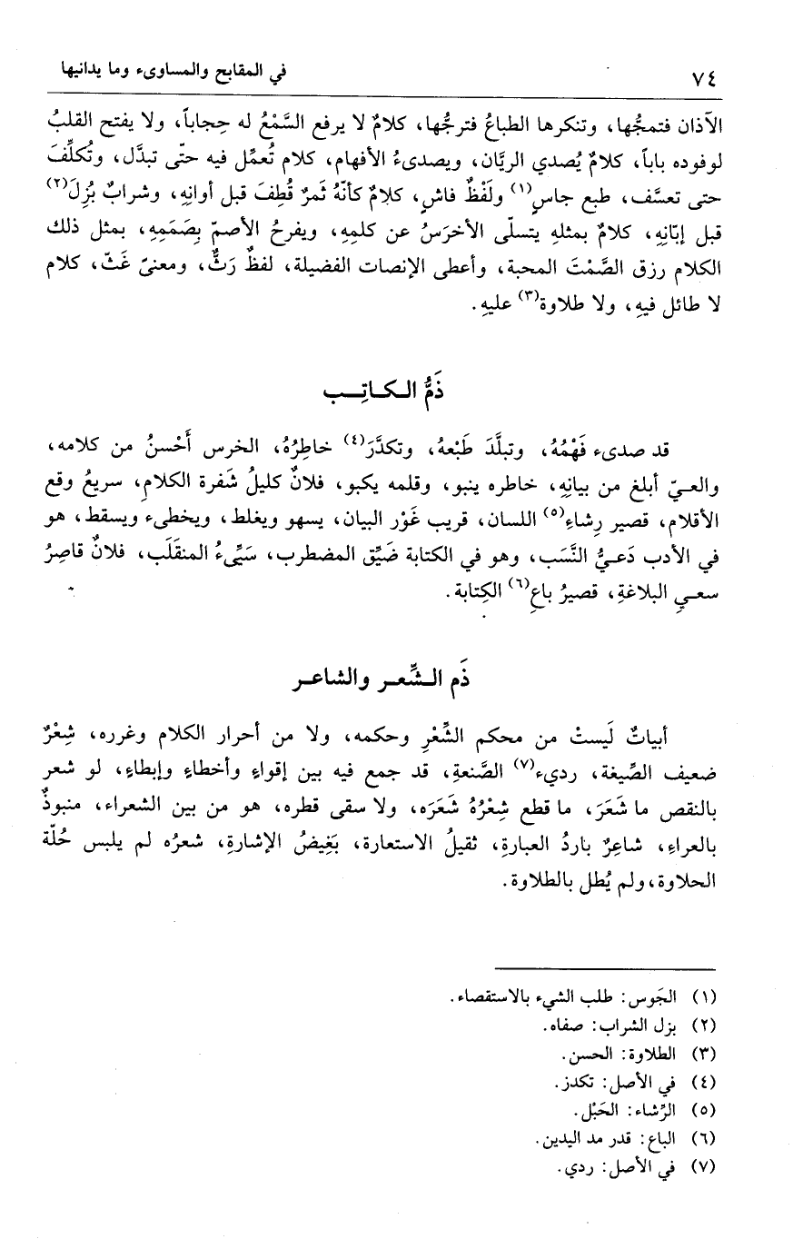 أبيات لَيستْ من محكم الشَعْرِ وحكمه، ولا من أحرار الكلام وغرره، شِعْر ضعيف الصِّيغة، رديء الصَّنعةِ، قد جمع فيه بين إقواءٍ وأخطاءٍ وإبطاءٍ، لو شعر بالنقص ما شَعَرَ، ما قطع شِعْرُهُ شَعَرَه، ولا سقى قطره، هو من بين الشعراء، منبوذٌ بالعراءِ، شاعِرٌ باردُ العبارةِ، ثقيلُ الاستعارة، بَغِيضُ الإشارةِ، شعرُه لم يلبس حُلّة الحلاوة، ولم يُطل بالطلاوة.
