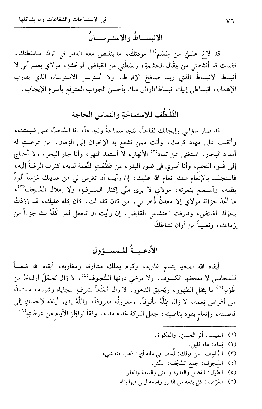 أبقاه الله لمجدٍ يتسم غاربه، وكرم يملك مشارقه ومغاربه، أبقاه الله شمساً للمحاسن لا يمحقها الكسوف، ولا يرخي دونها السُّجوف، لا زال يُحمّلُ أولياءَهُ من طَوْله ما يثقل الظهور، ويُخلِق الدهور، لا زال مُمَتّعاً بشرفِ سجاياه وشيمه، مستمدًّا من أغراس نِعمه، لا زال ظِلُّهُ مألوفاً، ومعروفُه معروفاً، واللَّهُ يديم أيامَه لإحسانٍ إلى قاصيته، وإنعام يقود بناصيته، جعل البركة غذاء مدته، وفقأ نواظِرَ الأيامِ من عرصَته.