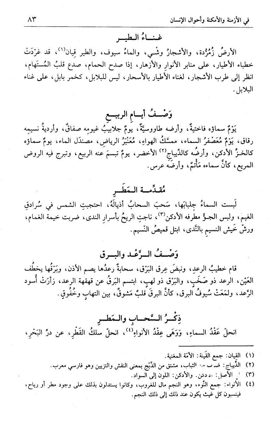 الأرضُ زُمُرُّدة، والأشجارُ وشْي، والماءُ سيوف، والطير قِيان، قد غرّدَتْ خطباء الأطيار، على منابر الأنوارِ والأزهار، إذا صدح الحمام، صدع قلبُ المُستَهام، انظر إلى طرب الأشجار، لغناء الأطيار بالأسحار، ليس للبلابل، كخمر بابل، على غناء البلابل.