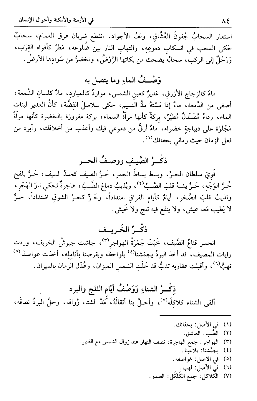 انحسر قناعُ الصيف، خَبَتْ جَمْرَةُ الهواجرِ، جاشت جيوشُ الخريف، وردت رايات المصيف، قد أخذ البردُ يجمّشنا بلواحظه ويقرصنا بأنامِلِه، أخذت عواصفه تهبٌّ، وأقبلت عقاربه تدبُّ قد حَلّتِ الشمس الميزان، وعُدِّل الزمان بالميزان.